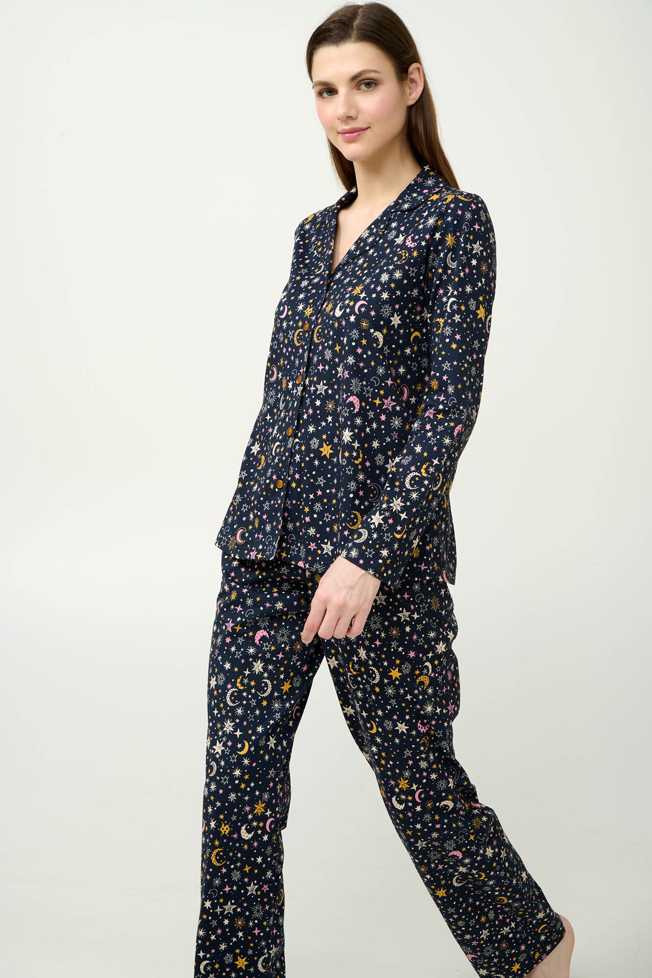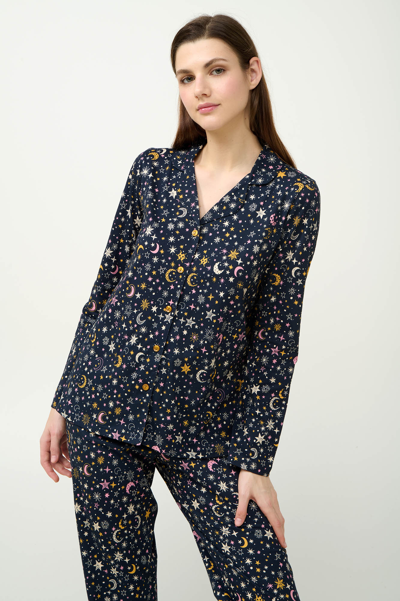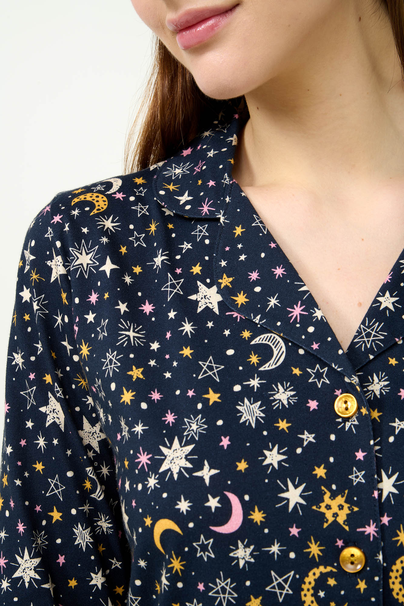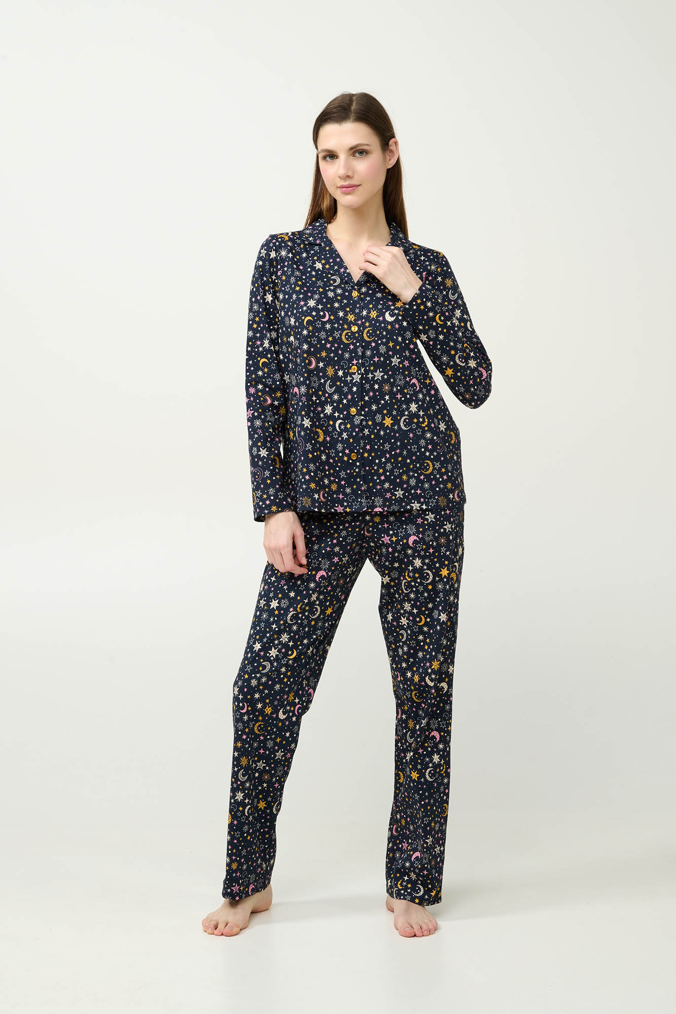 Προσθέστε στη γκαρνταρόμπα σας ένα σετ χειμερινές γυναικείες πυτζάμες, κατασκευασμένες από 100% βαμβάκι s. jersey, που ακουμπά απαλά το σώμα και επιτρέπει στο δέρμα να αναπνέει. Είναι σχεδιασμένο με κλασικό κουμπωτό πώνω μέρος, με ένα μοτίβο από αστέρια, φεγγάρια και κοσμικά σύμβολα που προσθέτουν μια ονειρική νότα στις στιγμές χαλάρωσης σας.