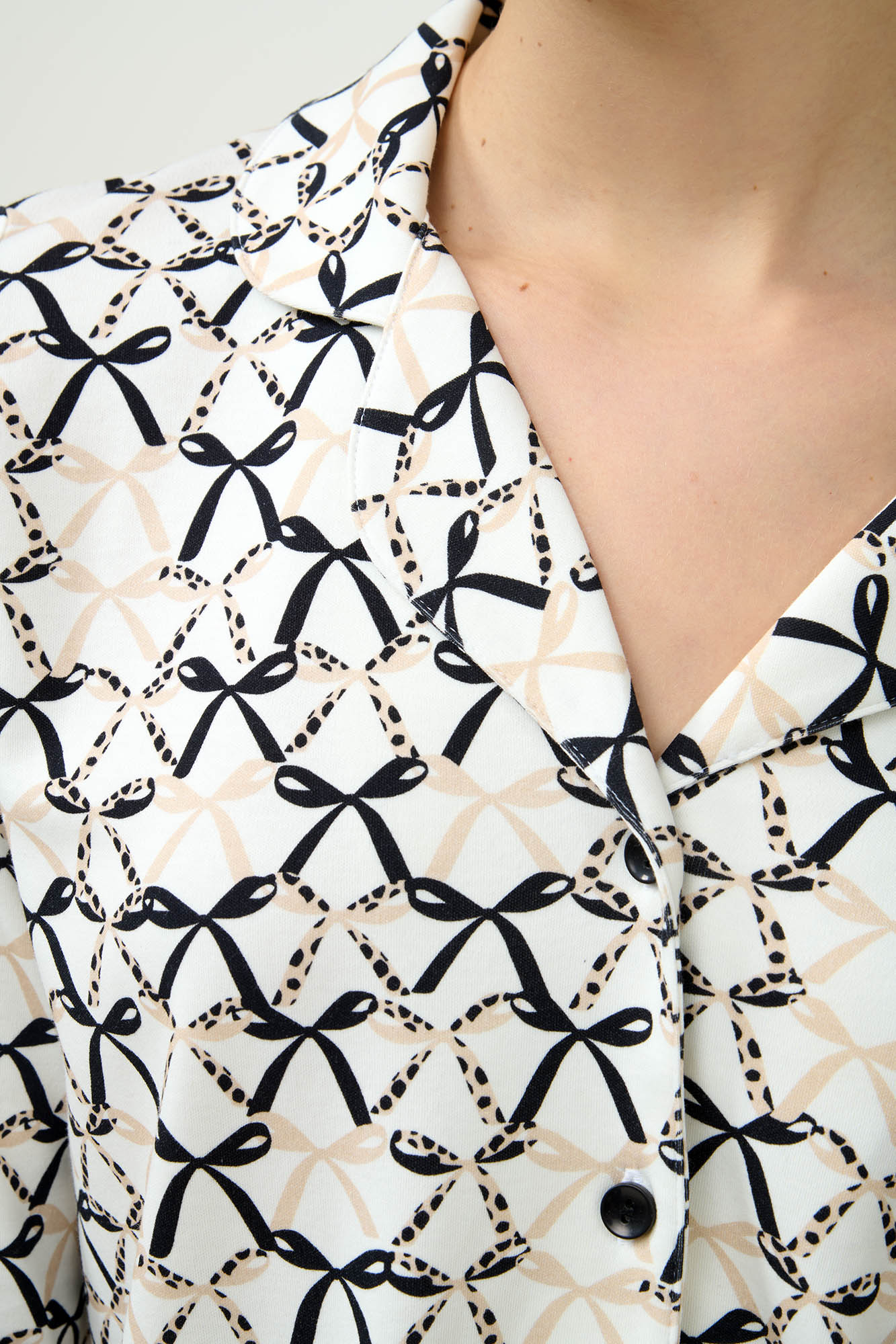Αυτές οι γυναικείες πυτζάμες είναι φτιαγμένες από απαλό και ανθεκτικό 100% βαμβάκι interlock, προσφέροντας εξαιρετική διαπνοή και άνεση. Το κλασικό κουμπωτό πάνω μέρος διαθέτει κομψό μοτίβο με φιόγκους, προσθέτοντας μια διαχρονική νότα και συνδυάζεται ιδανικά με μονόχρωμο μαύρο παντελόνι, που χαρίζει ισορροπία στο σύνολο. Ιδανικό για στιγμές χαλάρωσης ή ύπνου, αποτελεί μια πρακτική που θα απολαύσετε για χρόνια.