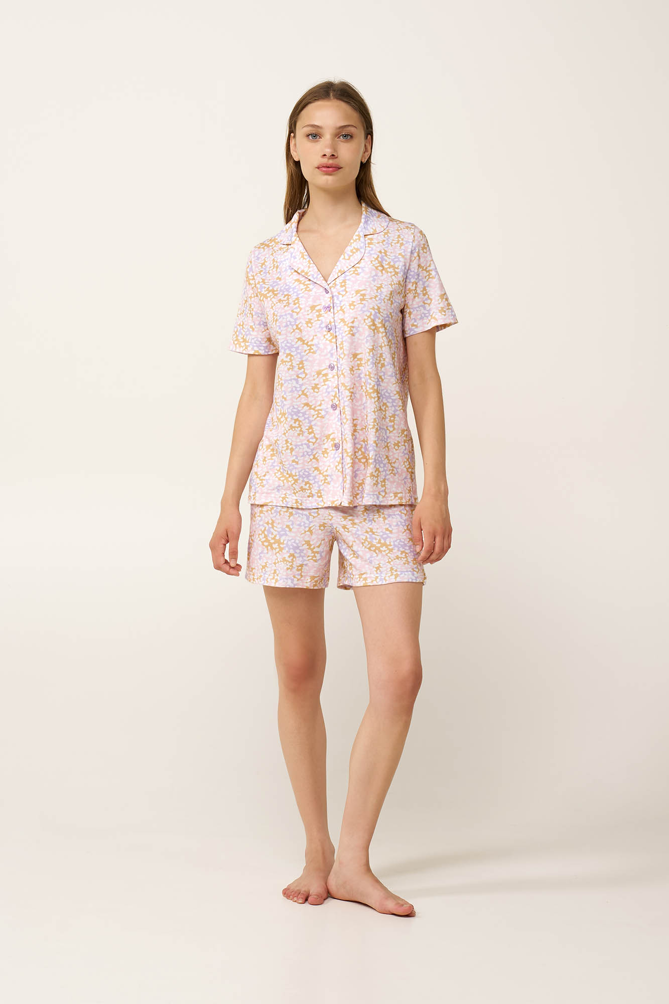Άνετο, δροσερό και κομψό, αυτό το γυναικείο καλοκαιρινό σετ πυτζάμες είναι σχεδιασμένο για χαλαρές στιγμές στο σπίτι. Κατασκευασμένο από απαλό, διαπνέον 100% βαμβάκι single jersey, διαθέτει κλασικό κουμπωτό πάνω μέρος, σε συνδυασμό με ασορτί κοντό παντελόνι με άνετη εφαρμογή. Ιδανικό για χαλάρωση, ύπνο ή ξεκούραση στο σπίτι, το σετ αυτό συνδυάζει την καθημερινή άνεση με διαχρονική κομψότητα.