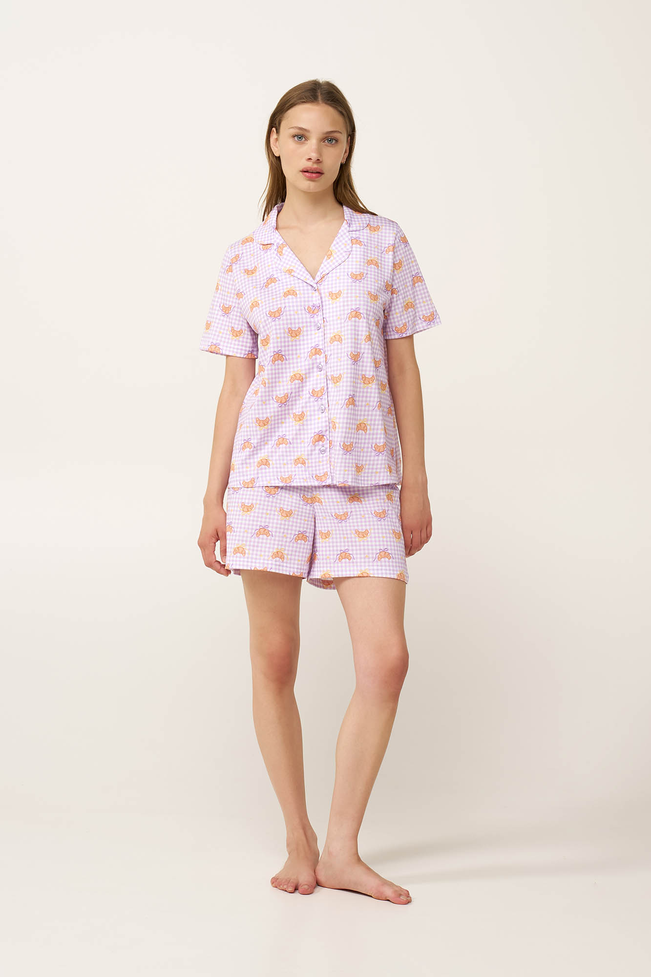 Άνετο και γεμάτο γοητεία, αυτό το γυναικείο σετ πιτζάμες είναι κατασκευασμένο από διαπνέον 100% βαμβάκι, προσφέροντας απαλή και δροσερή αίσθηση. Αποτελείται από κλασικό κοντομάνικο τοπ με κουμπιά που συνδυάζεται με ένα ασορτί κοντό παντελόνι, δημιουργώντας ένα διαχρονικό σύνολο. Σχεδιασμένο με χαριτωμένο, φρέσκα κρουασάν πάνω σε καρό gingham μοτίβο, το σετ αποπνέει γλυκιά, cozy διάθεση και διακριτική θηλυκότητα, ενώ είναι ιδανικό για χαλάρωση, ξεκούραση και έναν ήρεμο, απολαυστικό ύπνο.