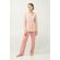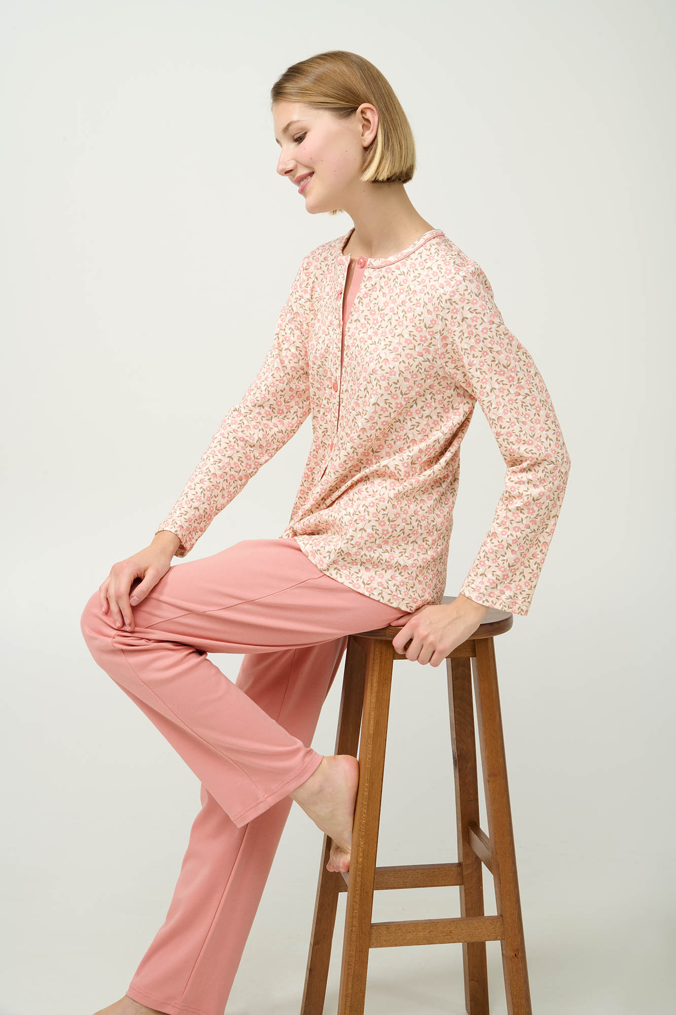 Απολαύστε ευχάριστα απογεύματα φορώντας ένα σετ γυναικείες πυτζάμες, κατασκευασμένο από 100% βαμβάκι interlock για εξαιρετική απαλότητα και διαπνοή. Το επάνω μέρος, διακοσμημένο με απαλό ροζ φλοράλ μοτίβο, προσφέρει μια διακριτική και θηλυκή νότα, ενώ το κλασικό κουμπωτό του σχέδιο προσθέτει διαχρονική κομψότητα. Συνδυάζεται με μονόχρωμο παντελόνι, δημιουργώντας μια ισορροπία στο σύνολο. Ιδανικό για στιγμές χαλάρωσης ή ένα ξεκούραστο βραδινό ύπνο.