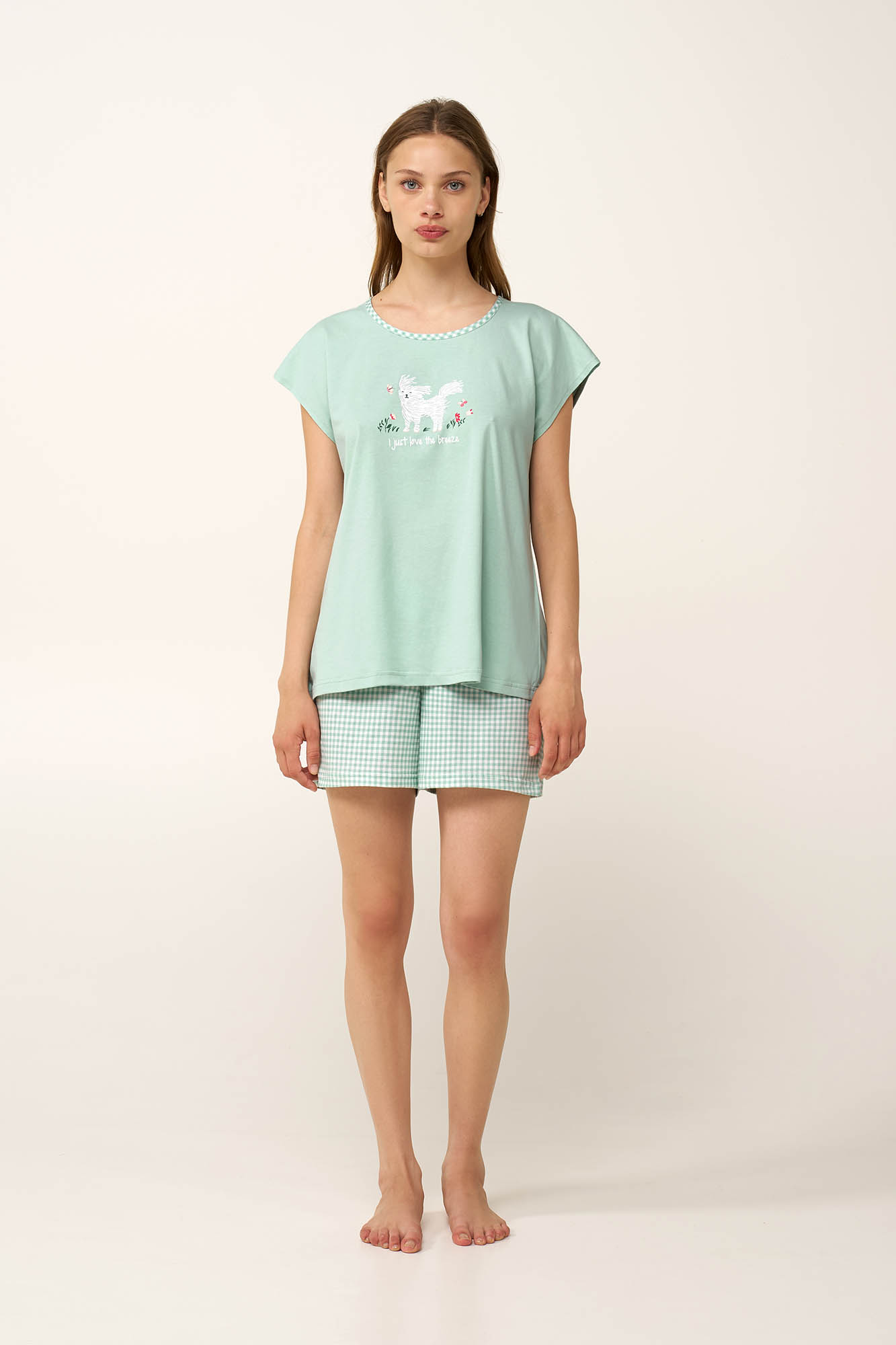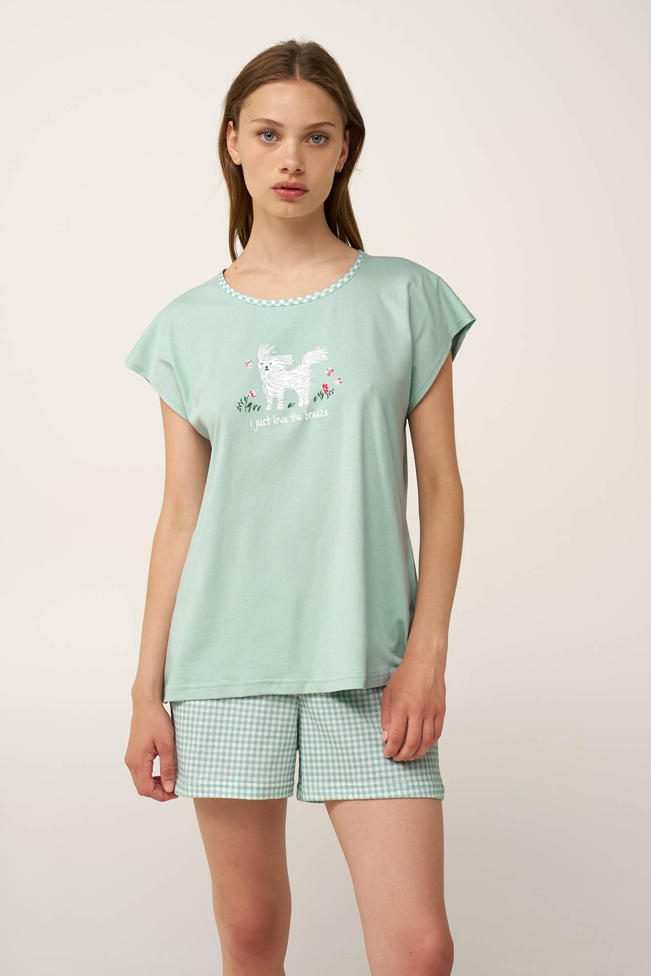 Δώστε άνεση στη καθημερινότητα σας με αυτό το γυναικείο σετ πυτζάμες, κατασκευασμένο από απαλό και διαπνέον 100% βαμβάκι single jersey. Το κοντομάνικο τοπ διαθέτει ένα χαριτωμένο τύπωμα στο στήθος, προσθέτοντας μια παιχνιδιάρικη και γοητευτική νότα, ενώ το κοντό παντελόνι φέρει ένα διαχρονικό καρό gingham που θυμίζει καθαρό ουρανό και θαλασσινή αύρα. Ισορροπημένο και δροσερό, το σετ είναι ιδανικό για χαλάρωση ή έναν ήρεμο, ξεκούραστο ύπνο..