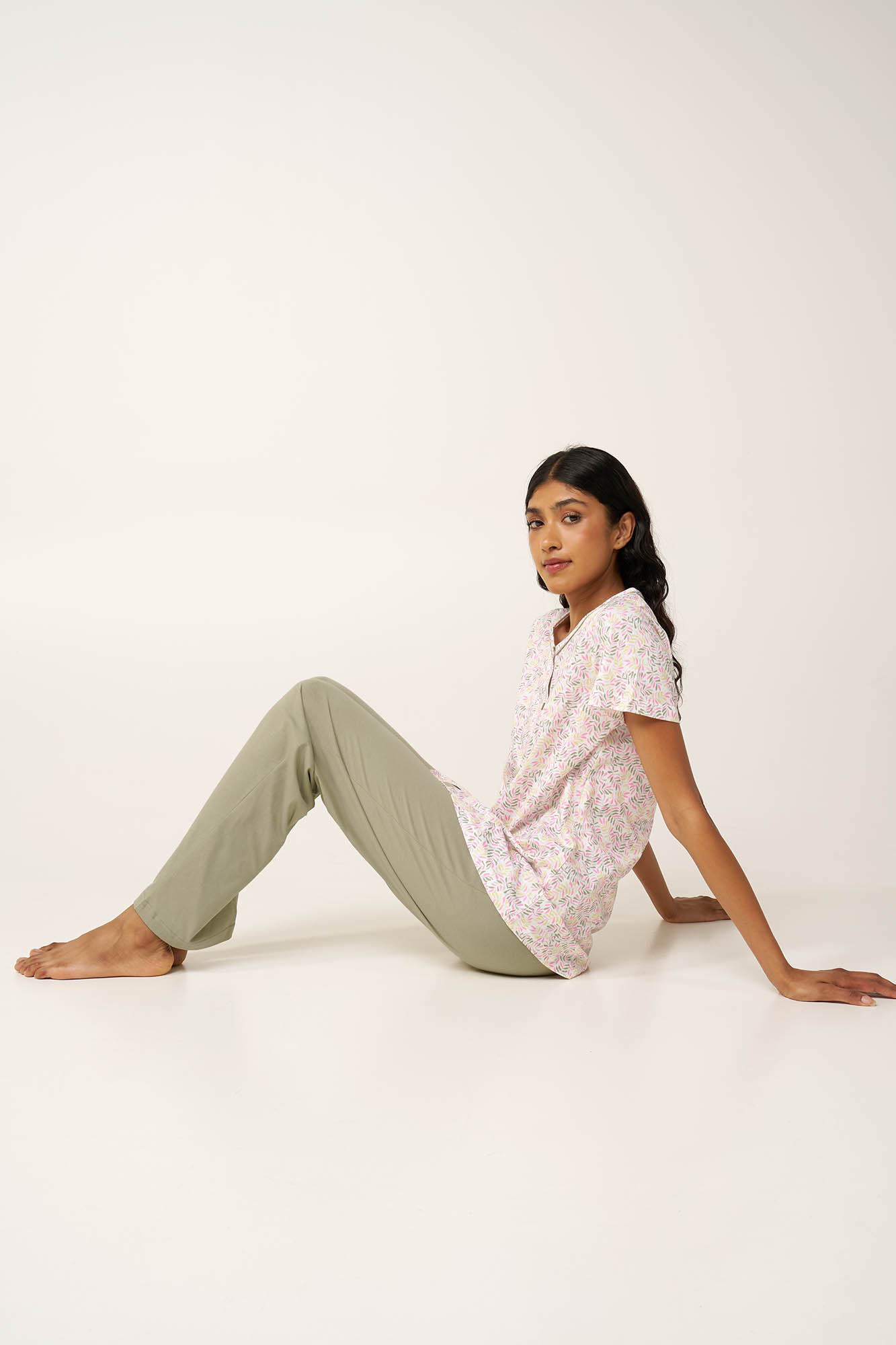 Προσθέστε στην γκαρνταρόμπα σας αυτή τη γυναικεία πυτζάμα, κατασκευασμένη από απαλό και διαπνέον 100% βαμβάκι single jersey. Το σετ αποτελείται από ένα κλασικό, κουμπωτό τοπ με botanical print μοτίβο, που συνδυάζεται μέ νεα μονόχρωμο, μακρύ παντελόνι. Μια ιδιαίτερη επιλογή, για δροσερές καλοκαιρινές νύχτες στην αυλή, τον πρώτο πρωινό καφέ στο μπαλκόνι ή το βράδυ στο σπίτι με την παρέα σας.