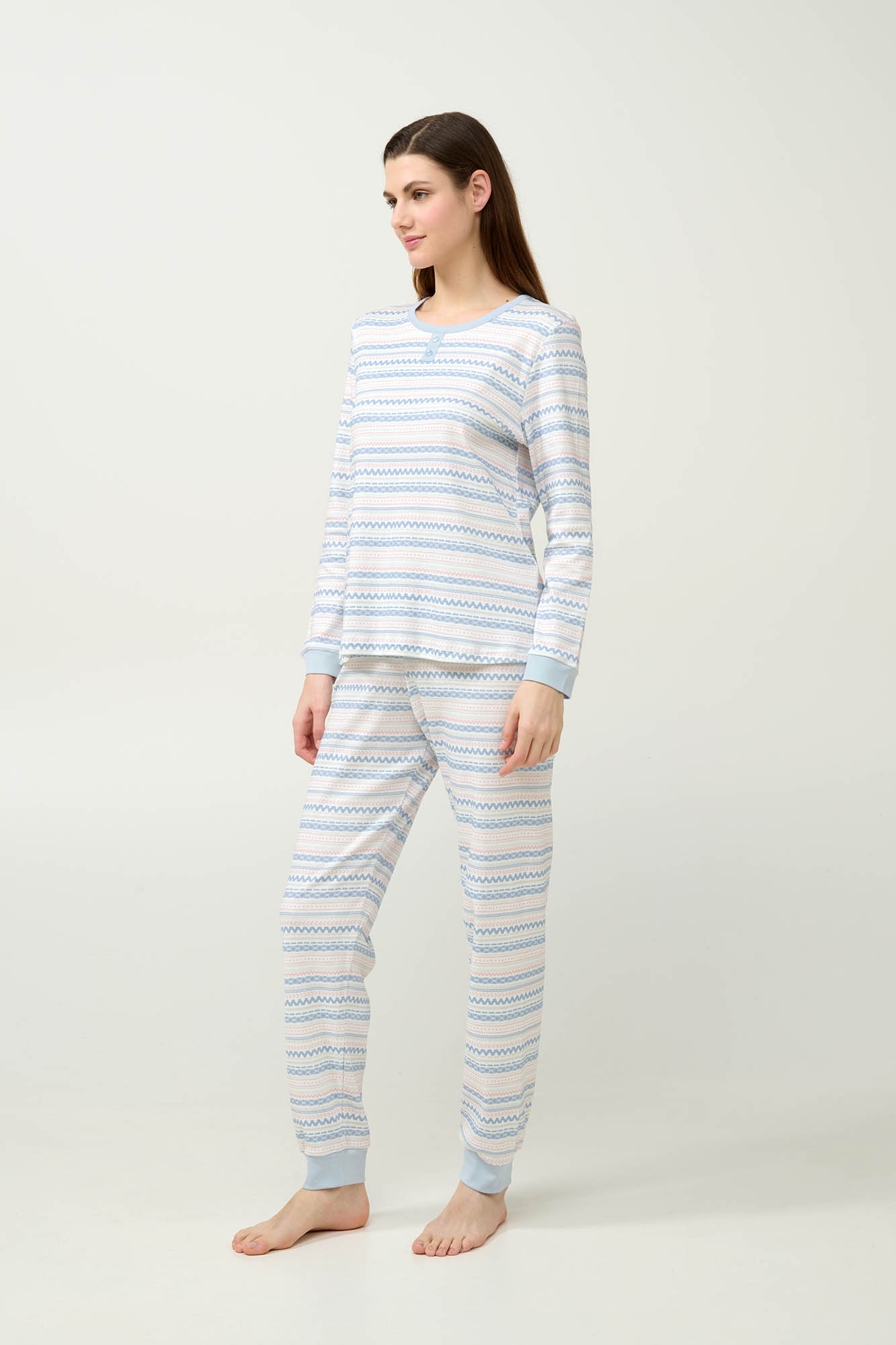 Ανακαλύψτε την απόλυτη άνεση αυτές τις χειμερινές γυναικείες πυτζάμες, κατασκευασμένες από υψηλής ποιότητας 100% βαμβάκι interlock. Σχεδιασμένο με μανσέτες στο παντελόνι και στα μανίκια για βέλτιστη εφαρμογή και διακοσμημένο με σκανδιναβικό μοτίβο σε απαλούς παστέλ τόνους, αυτό το σετ προσθέτει χειμερινή γοητεία και χαρακτήρα στις στιγμές χαλάρωσης σας.