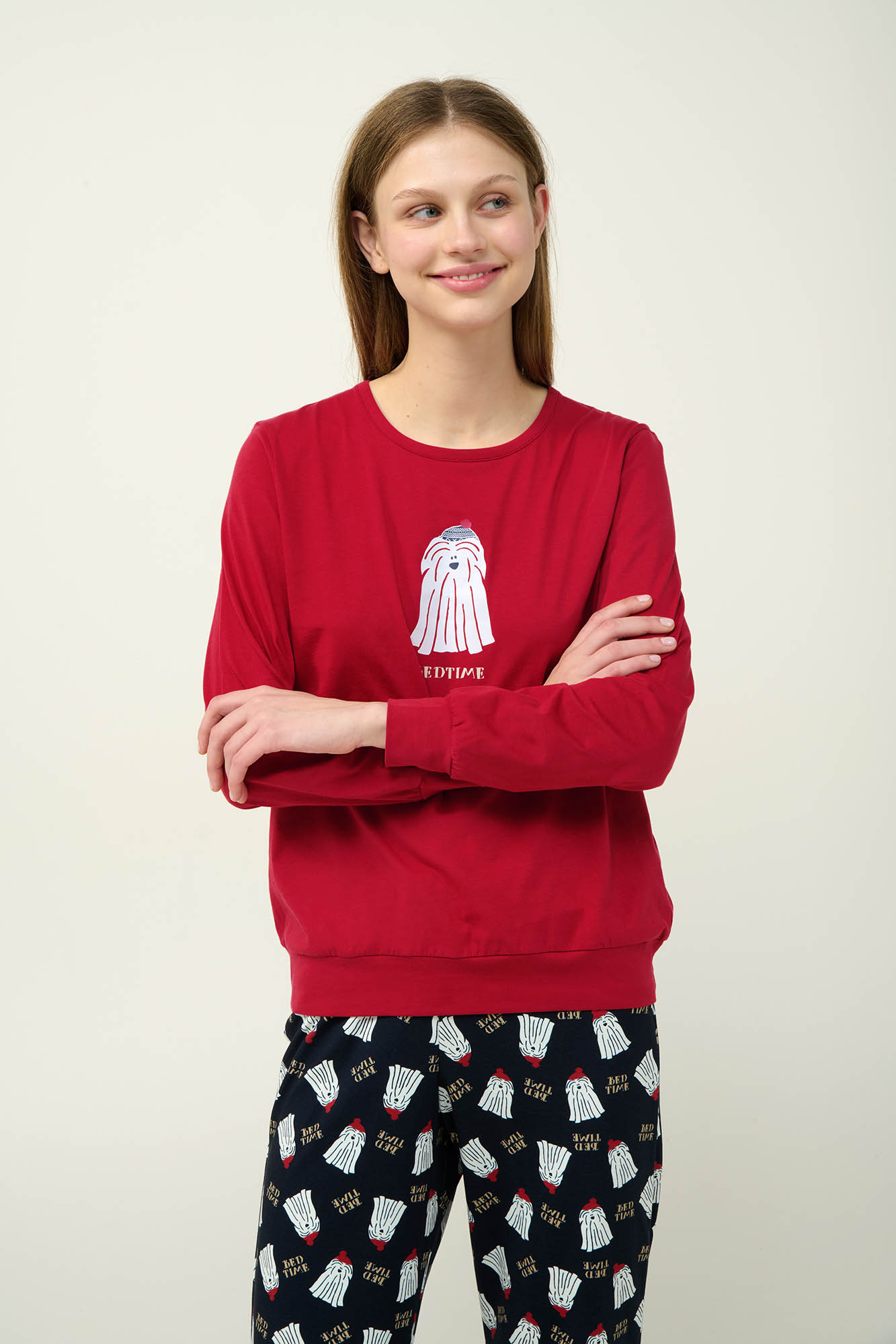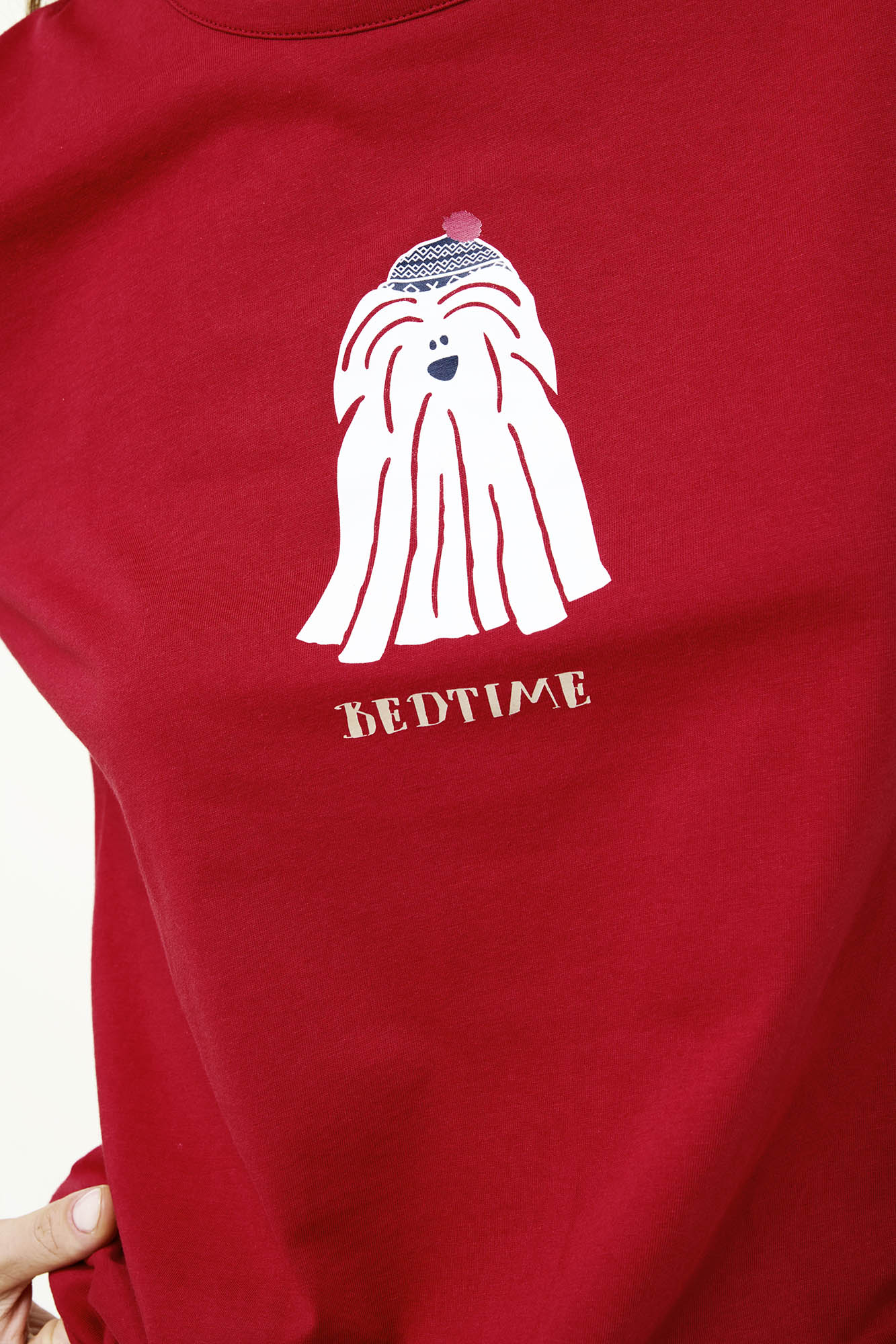 Προσθέστε στη γκαρνταρόμπα σας αυτό το σετ γυναικείες πυτζάμες, φτιαγμένο από 100% απαλό και διαπνέον βαμβάκι interlock. Το παντελόνι με μανσέτες φέρει ένα παιχνιδιάρικο σχέδιο με έναν κοιμισμένο σκύλο, που προσθέτει μια χαρούμενη νότα, ενώ το πάνω μέρος διαθέτει μανίκια με μανσέτες, ελαστική μέση και το ίδιο χαριτωμένο σχέδιο στο στήθος. Ιδανικό για στιγμές χαλάρωσης, με αντίστοιχα σχέδια για όλη την οικογένεια.