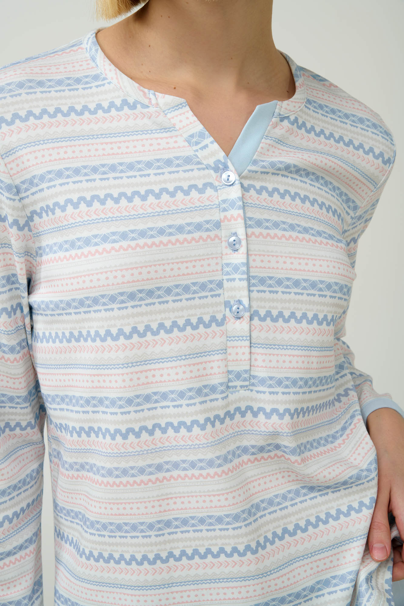 Απολαύστε τα βράδια του χειμώνα με αυτό το σετ γυναικείες πυτζάμες, κατασκευασμένο από 100% βαμβάκι interlock που προσφέρει απαλή και διαπνέουσα αίσθηση στο σώμα. Το επάνω μέρος είναι σχεδιασμένο με πατιλέτα σε σκανδιναβικό μοτίβο σε παστέλ αποχρώσεις, προσθέτοντας μια κομψή και γοητευτική νότα. Συνδυάζεται με μονόχρωμο γαλάζιο παντελόνι, που δίνει ισορροπία στο σύνολο για να απολαύσετε κάθε στιγμή στο σπίτι.