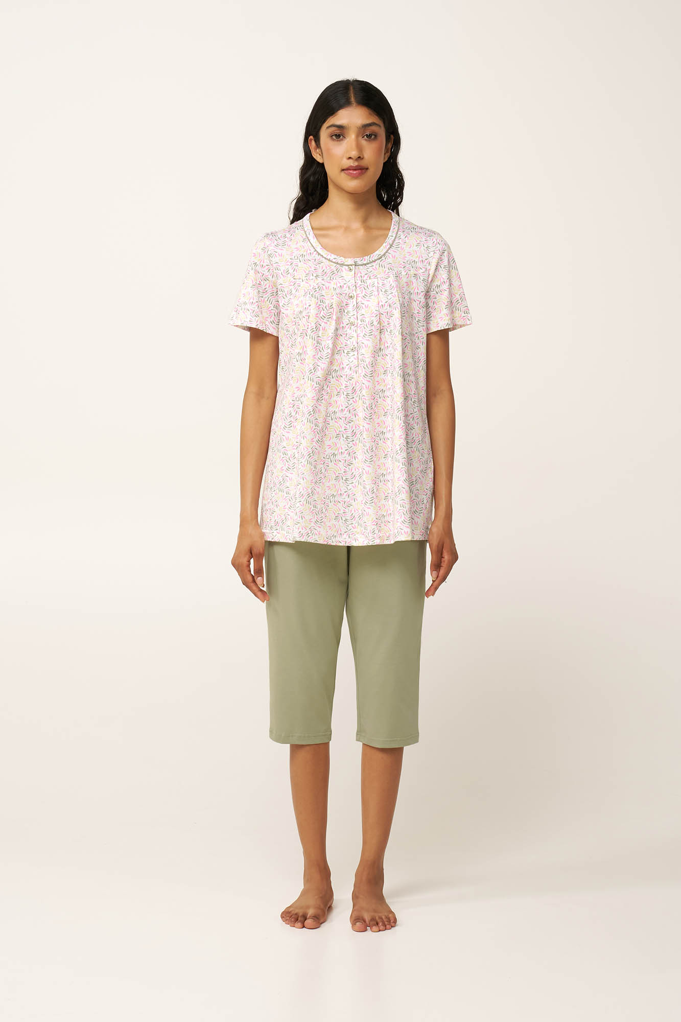 Επιλέξτε την άνεση που σας προσφέρει ένα σετ γυναικείες πυτζάμες, κατασκευασμένο από απαλό και διαπνέον 100% βαμβάκι single jersey που χαρίζει ελαφριά και αέρινη αίσθηση. Αποτελείται από φλοράλ τοπ με πατιλέτα που εξυπηρετεί το θηλασμό, ενώ οι διακριτικές πιέτες στο στήθος προσφέρουν επιπλέον χώρο για πιο χαλαρή και άνετη εφαρμογή. Το σετ συμπληρώνει ένα μονόχρωμο κάπρι παντελόνι. Ιδανικό για στιγμές χαλάρωσης και ήρεμες στιγμές στο σπίτι.