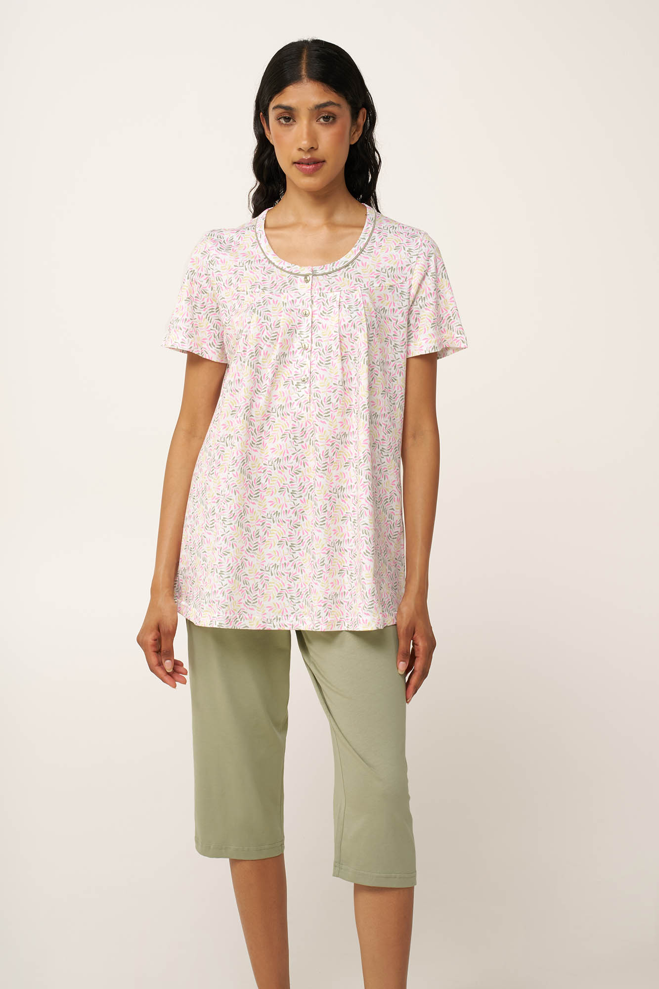 Επιλέξτε την άνεση που σας προσφέρει ένα σετ γυναικείες πυτζάμες, κατασκευασμένο από απαλό και διαπνέον 100% βαμβάκι single jersey που χαρίζει ελαφριά και αέρινη αίσθηση. Αποτελείται από φλοράλ τοπ με πατιλέτα που εξυπηρετεί το θηλασμό, ενώ οι διακριτικές πιέτες στο στήθος προσφέρουν επιπλέον χώρο για πιο χαλαρή και άνετη εφαρμογή. Το σετ συμπληρώνει ένα μονόχρωμο κάπρι παντελόνι. Ιδανικό για στιγμές χαλάρωσης και ήρεμες στιγμές στο σπίτι.