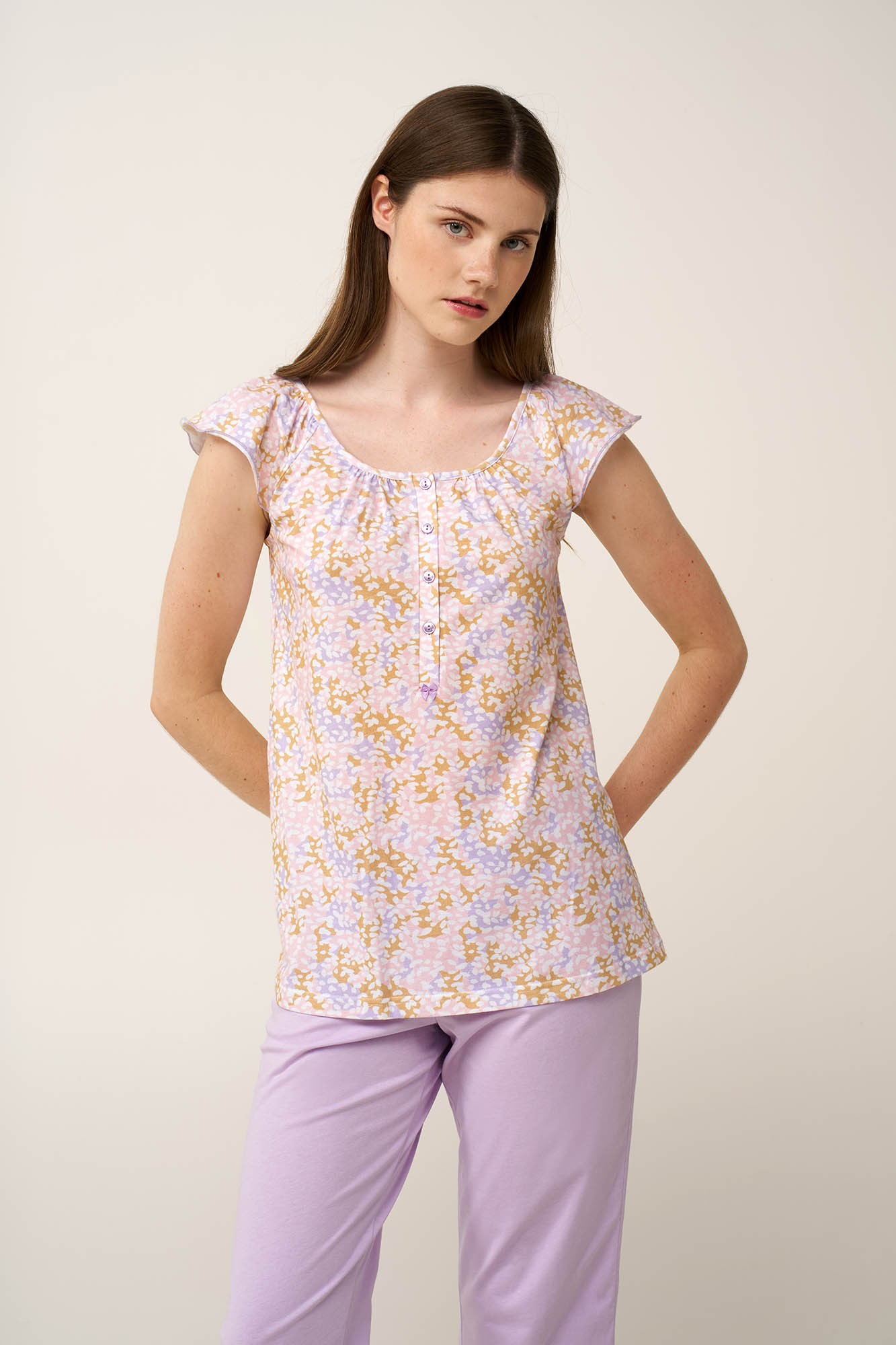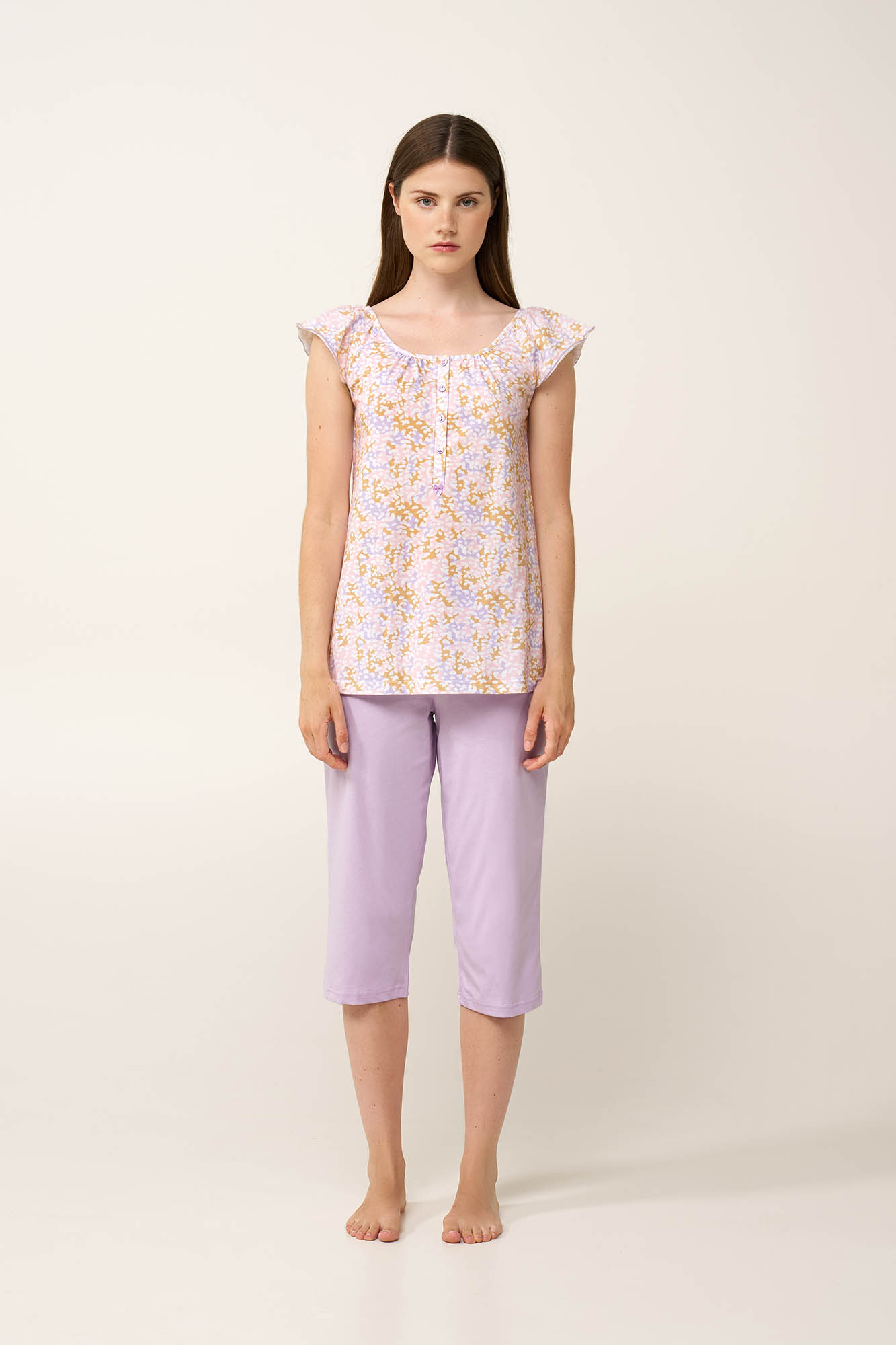 Δώστε φως και φρεσκάδα στη καθημερινότητα σας με αυτό το γυναικείο σετ πυτζάμες, από διαπνέον 100% βαμβάκι single jersey. Αποτελείται από τοπ με κλασική πατιλέτα και σούρες στο στήθος σε ένα παστέλ κολάζ μοτίβο, που χαρίζει ηρεμία και άνεση. Συνδυάζεται με μονόχρωμο λιλά κάπρι παντελόνι, δημιουργώντας ένα ισορροπημένο και ξεκούραστο σύνολο. Ελαφρύ και άνετο, αποτελεί ιδανική επιλογή για χαλάρωση και ξεκούραση κάθε στιγμή της ημέρας.