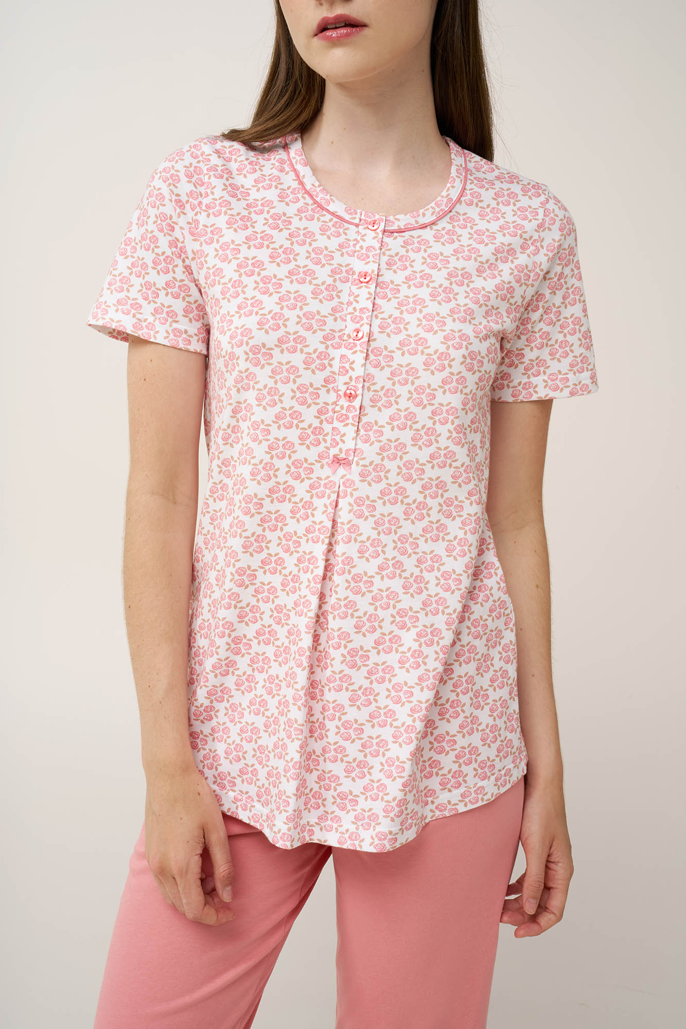 Επιλέξτε ένα σετ γυναικείες πυτζάμες, κατασκευασμένο από απαλό και διαπνέον 100% βαμβάκι single jersey. Αποτελείται από κοντομάνικο τοπ με πατιλέτα και διακριτική πιέτα από κάτω για πιο χαλαρή εφαρμογή, ενώ το ρομαντικό μοτίβο από τριαντάφυλλα σε ιβουάρ βάση, προσθέτει μια λεπτεπίλεπτη, θηλυκή γοητεία. Σε συνδυασμό με μονόχρωμο κάπρι παντελόνι, το σετ ισορροπεί ιδανικά ανάμεσα στην κομψότητα και την άνεση, αποτελώντας μια διαχρονική και πρακτική επιλογή για χαλάρωση ή ύπνο.