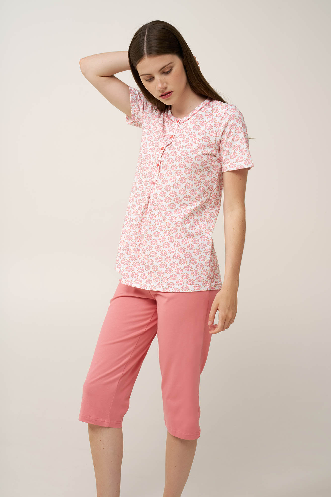 Επιλέξτε ένα σετ γυναικείες πυτζάμες, κατασκευασμένο από απαλό και διαπνέον 100% βαμβάκι single jersey. Αποτελείται από κοντομάνικο τοπ με πατιλέτα και διακριτική πιέτα από κάτω για πιο χαλαρή εφαρμογή, ενώ το ρομαντικό μοτίβο από τριαντάφυλλα σε ιβουάρ βάση, προσθέτει μια λεπτεπίλεπτη, θηλυκή γοητεία. Σε συνδυασμό με μονόχρωμο κάπρι παντελόνι, το σετ ισορροπεί ιδανικά ανάμεσα στην κομψότητα και την άνεση, αποτελώντας μια διαχρονική και πρακτική επιλογή για χαλάρωση ή ύπνο.
