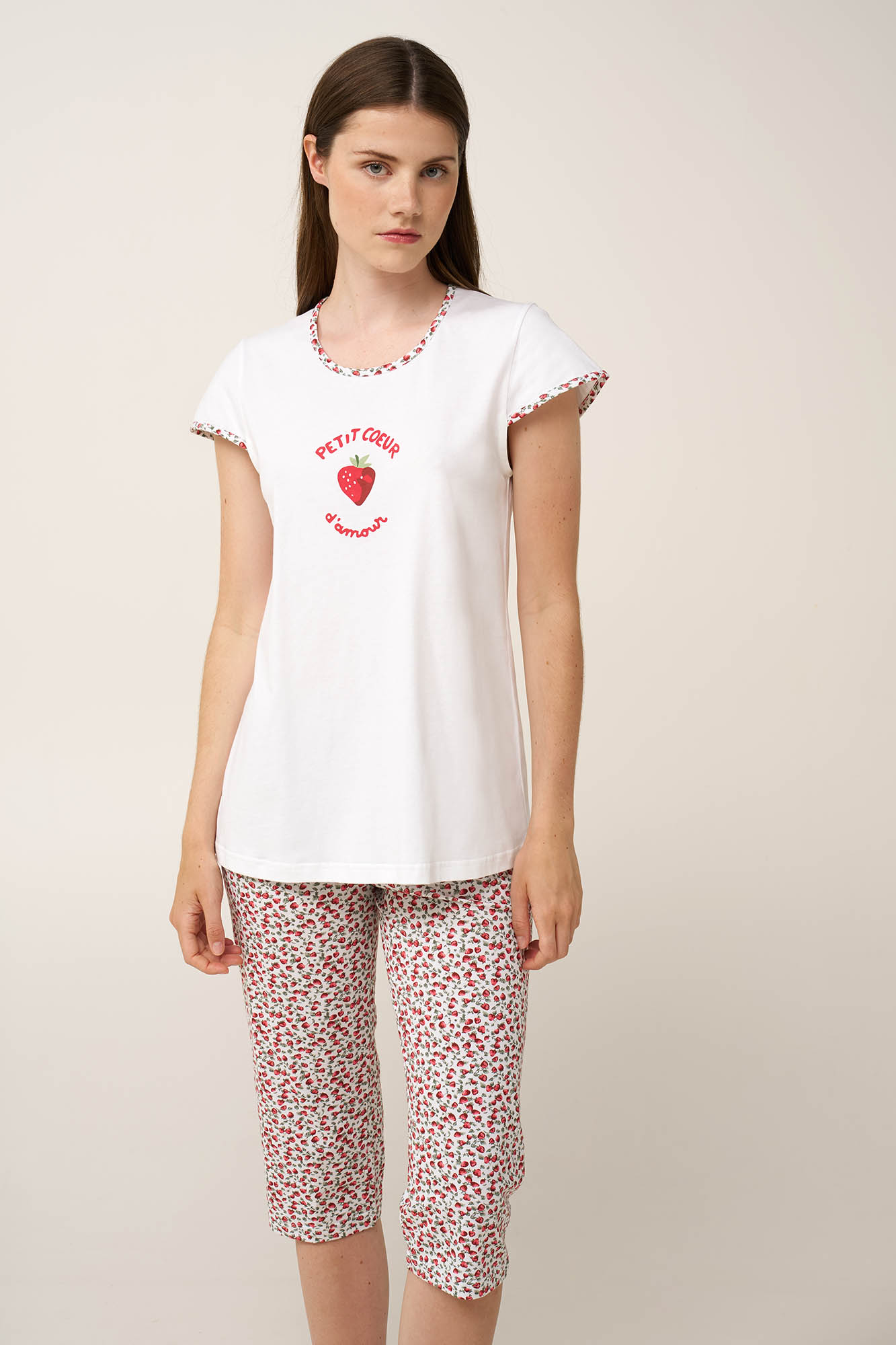 Προσθέστε μια απαλή και γοητευτική νότα στη μέρα σας με αυτό το γυναικείο σετ πυτζάμες, σχεδιασμένο για χαλαρή καλοκαιρινή άνεση. Κατασκευασμένο από απαλό και διαπνέον 100% βαμβάκι single jersey, προσφέρει δροσερή και ευχάριστη αίσθηση στο σώμα. Το λευκό κοντομάνικο τοπ διακοσμείται με μια γλυκιά φράουλα σε σχήμα καρδιάς, ενώ το κάπρι παντελόνι φέρει ένα χαρούμενο all-over print φράουλας σε λευκό καμβά. Ένα σετ που συνδυάζει άνεση και θηλυκότητα, ιδανικό για χαλάρωση στο σπίτι ή για ήρεμες, ξεκούραστες νύχτες.