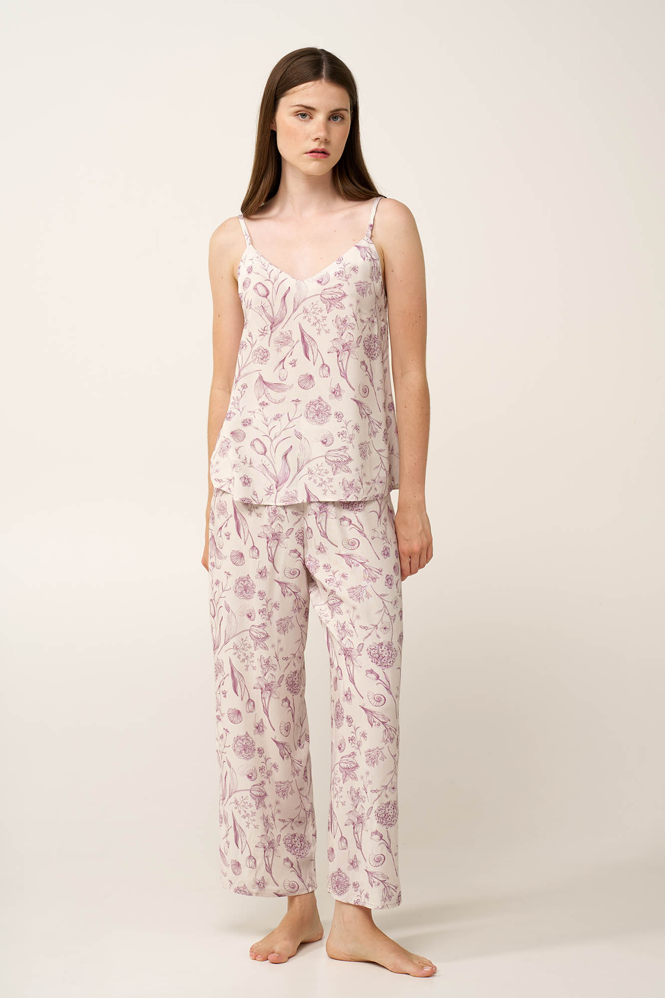 Προσθέστε στην γκαρνταρόμπα σας ένα κομψό γυναικείο σετ πυτζάμες, κατασκευασμένο από viscose ποπλίνα, που χαρίζει ανάλαφρη αίσθηση στο σώμα. Αποτελείται από ένα ελαφρύ τοπ με λεπτές τιράντες και κολακευτική V λαιμόκοψη που το συνοδεύει ένα αέρινο παντελόνι 7/8 σε χαλαρή γραμμή. Το λεπτεπίλεπτο φλοράλ μοτίβο σε απαλή ροζ απόχρωση δημιουργεί μια ήρεμη, θηλυκή διάθεση για να απολαύσετε κάθε στιγμή με κομψότητα, άνεση και ρομαντισμό.