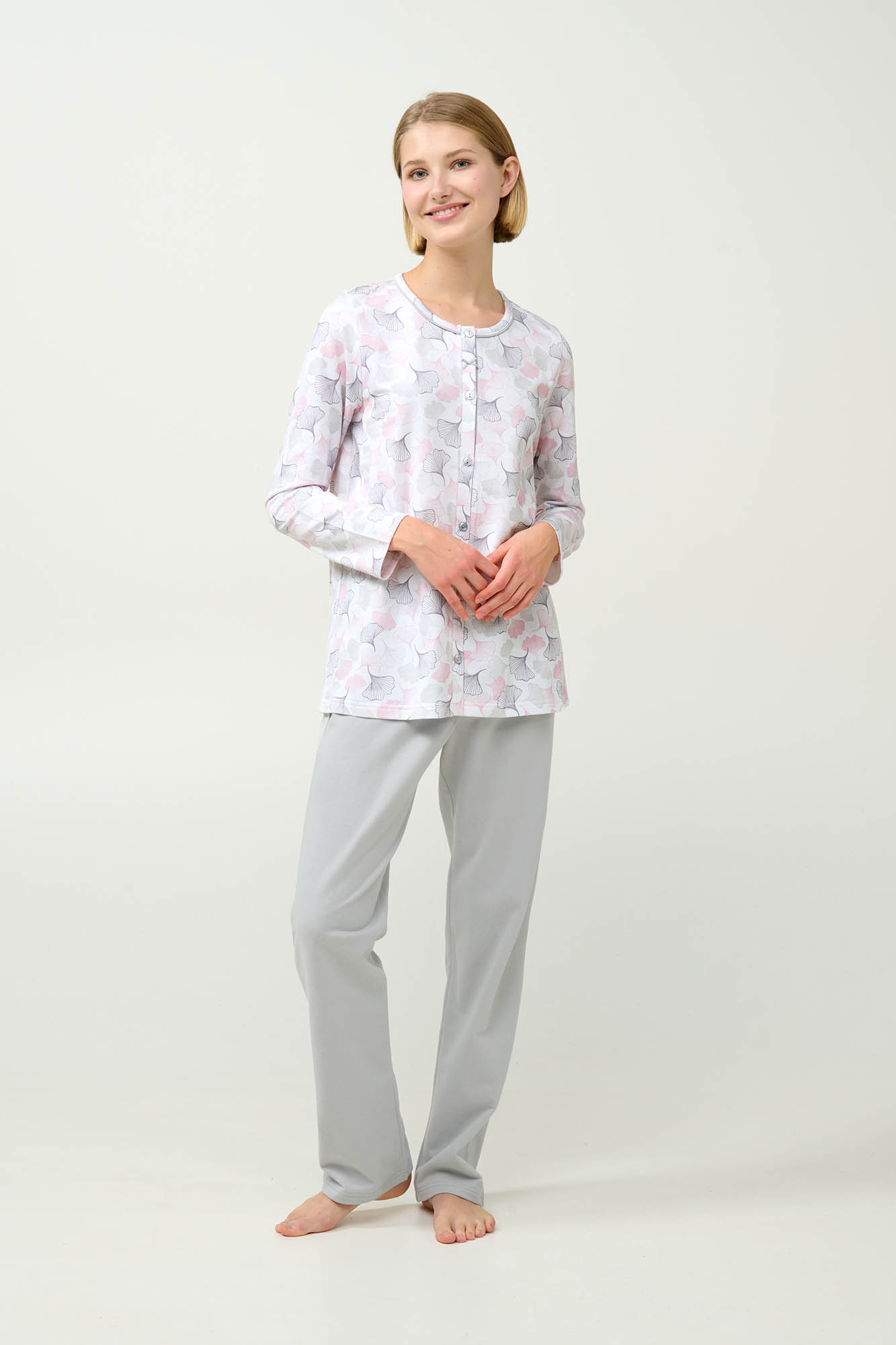 Προσθέστε στη συλλογή σας αυτό το σετ γυναικείες χειμερινές πυτζάμες, κατασκευασμενό από 100% βαμβάκι φούτερ για φυσική ζεστασιά και απαλή υφή. Σχεδιασμένο με κλασικό κουμπωτό μπροστινό μέρος, είναι διακοσμημένο με ένα κομψό μοτίβο από παστέλ φύλλα, που προσφέρει μια νότα διαχρονικής γοητείας. Συνδυάζεται με μονόχρωμο παντελόνι που χαρίζει ισορροπία στο σύνολο. Ιδανικό για κρύες νύχτες και χαλαρά πρωινά.