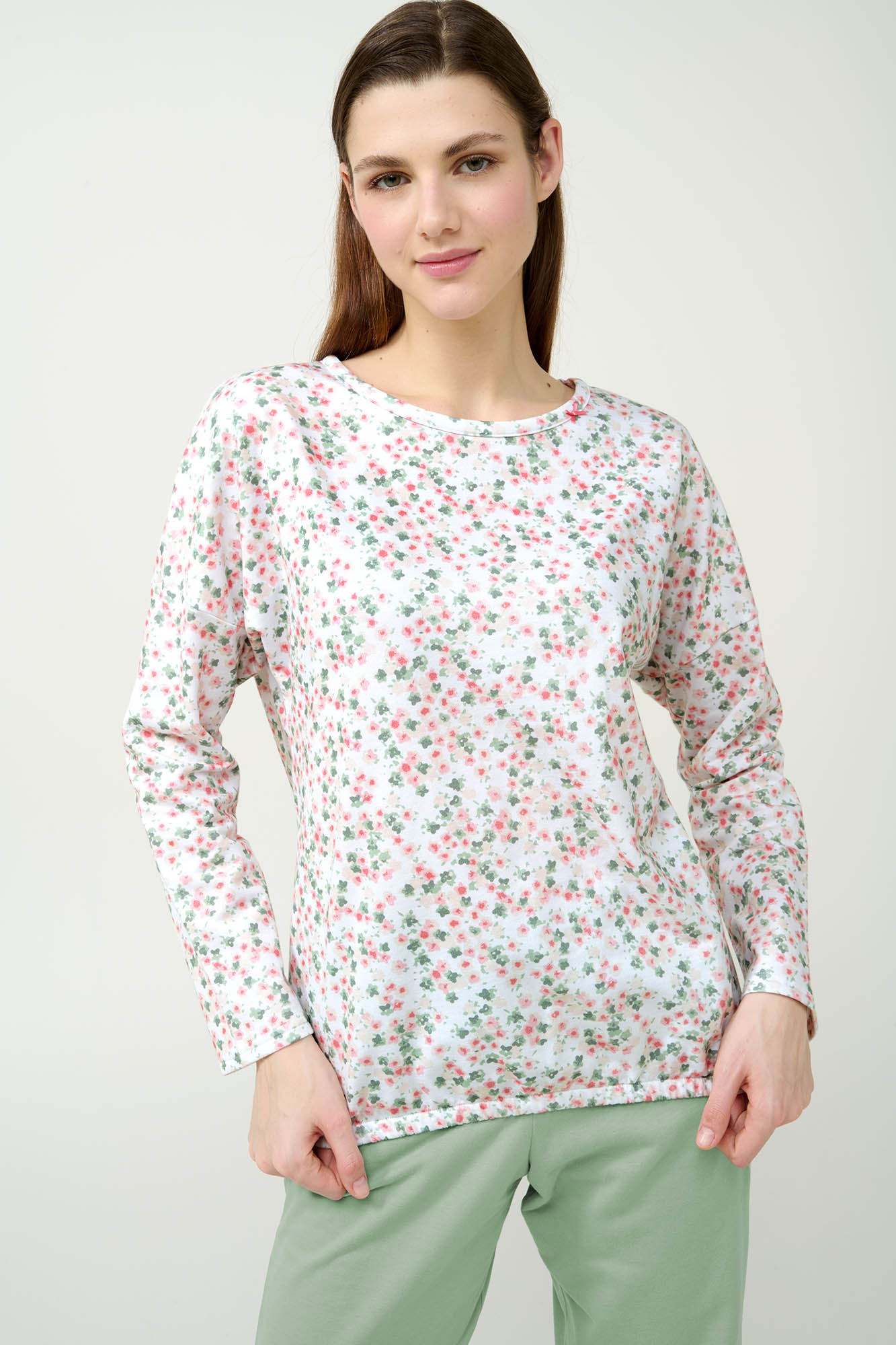 Απολαύστε την άνεση και τη γοητεία που χαρίζουν αυτές οι γυναικείες πυτζάμες, κατασκευασμένες από 100% βαμβάκι φούτερ. Το μονόχρωμο παντελόνι αποτελεί μια απλή και ευέλικτη βάση, ενώ το πάνω μέρος διαθέτει μακριά μανίκια, ελαστική μέση για καλύτερη εφαρμογή και ένα ρομαντικό φλοράλ μοτίβο που προσθέτει μια λεπτή, θηλυκή νότα. Ένα απαραίτητο κομμάτι που θα σας βοηθήσει να χαλαρώσετε μετά από μια μεγάλη ημέρα.