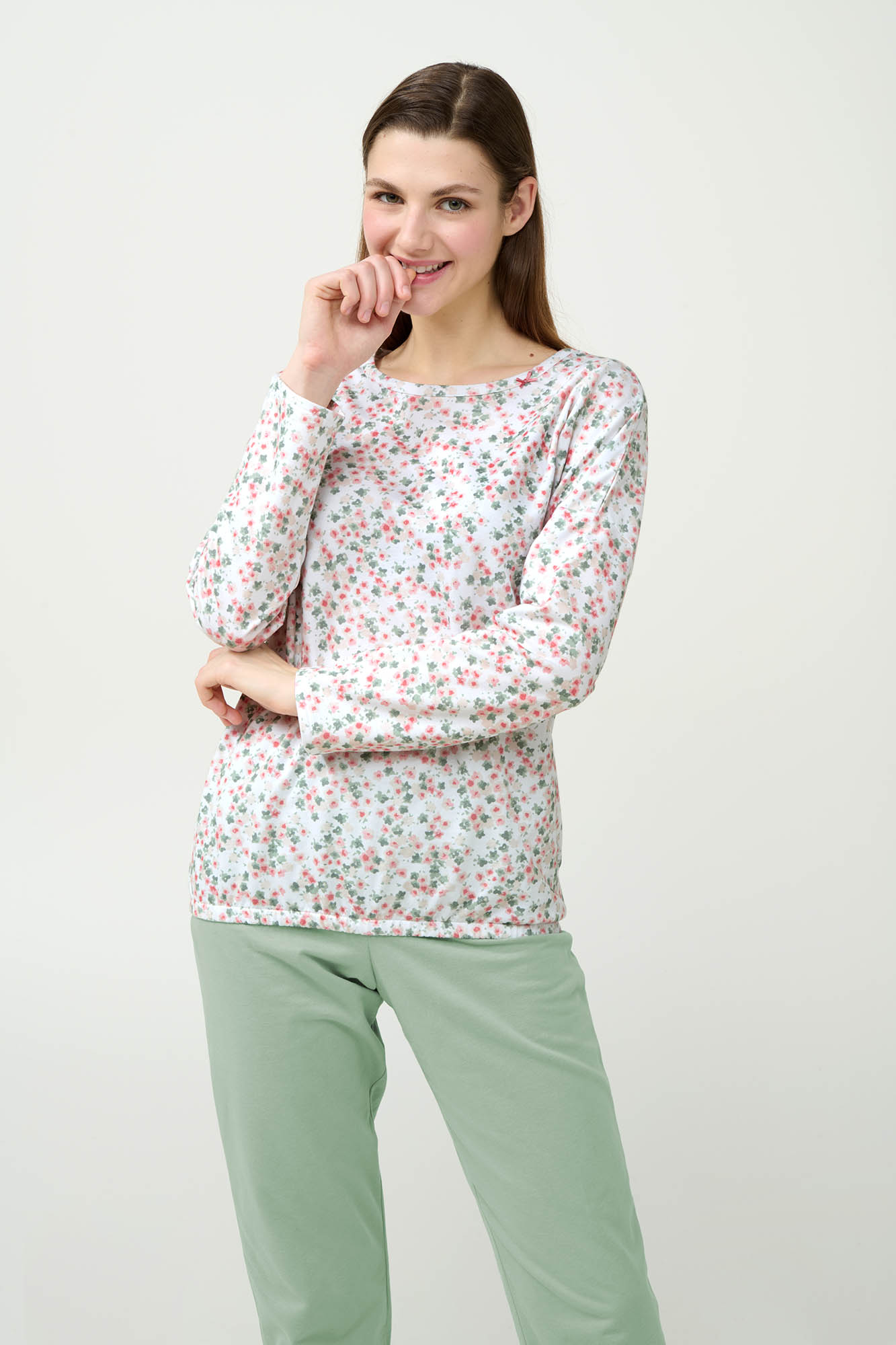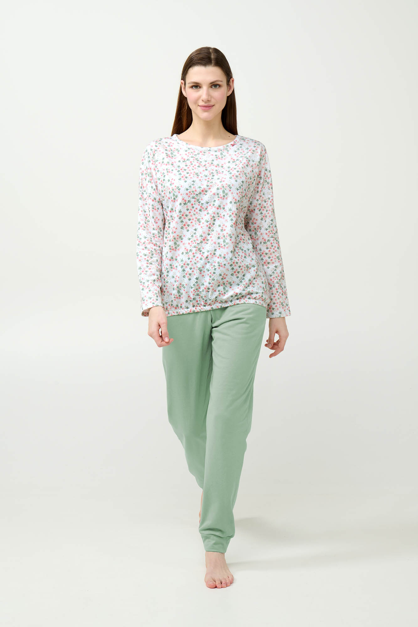 Απολαύστε την άνεση και τη γοητεία που χαρίζουν αυτές οι γυναικείες πυτζάμες, κατασκευασμένες από 100% βαμβάκι φούτερ. Το μονόχρωμο παντελόνι αποτελεί μια απλή και ευέλικτη βάση, ενώ το πάνω μέρος διαθέτει μακριά μανίκια, ελαστική μέση για καλύτερη εφαρμογή και ένα ρομαντικό φλοράλ μοτίβο που προσθέτει μια λεπτή, θηλυκή νότα. Ένα απαραίτητο κομμάτι που θα σας βοηθήσει να χαλαρώσετε μετά από μια μεγάλη ημέρα.