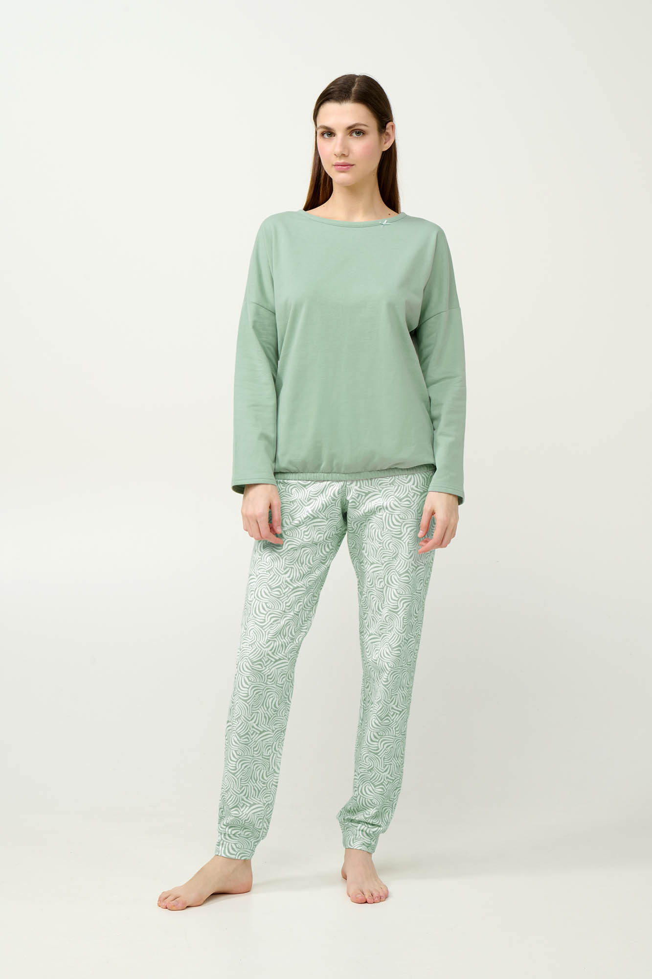 Αγκαλιάστε την άνεση και τη γοητεία που χαρίζει αυτό το σετ χειμερινές γυναικείες πυτζάμες, κατασκευασμένο από 100% βαμβάκι φούτερ που προσφέρει απαλή και ζεστή αίσθηση. Αποτελείται από παντελόνι με μανσέτες σε απαλό πράσινο μοτίβο εμπνευσμένο από ζέβρα, που προσδίδει μια διακριτική και μοντέρνα νότα. Το μονόχρωμο πάνω μέρος διαθέτει μακριά μανίκια και ελαστική μέση για βέλτιστη εφαρμογή και άνεση. Ένα cozy κομμάτι, ιδανικό για στιγμές χαλάρωσης ή τον βραδινό σας ύπνο.