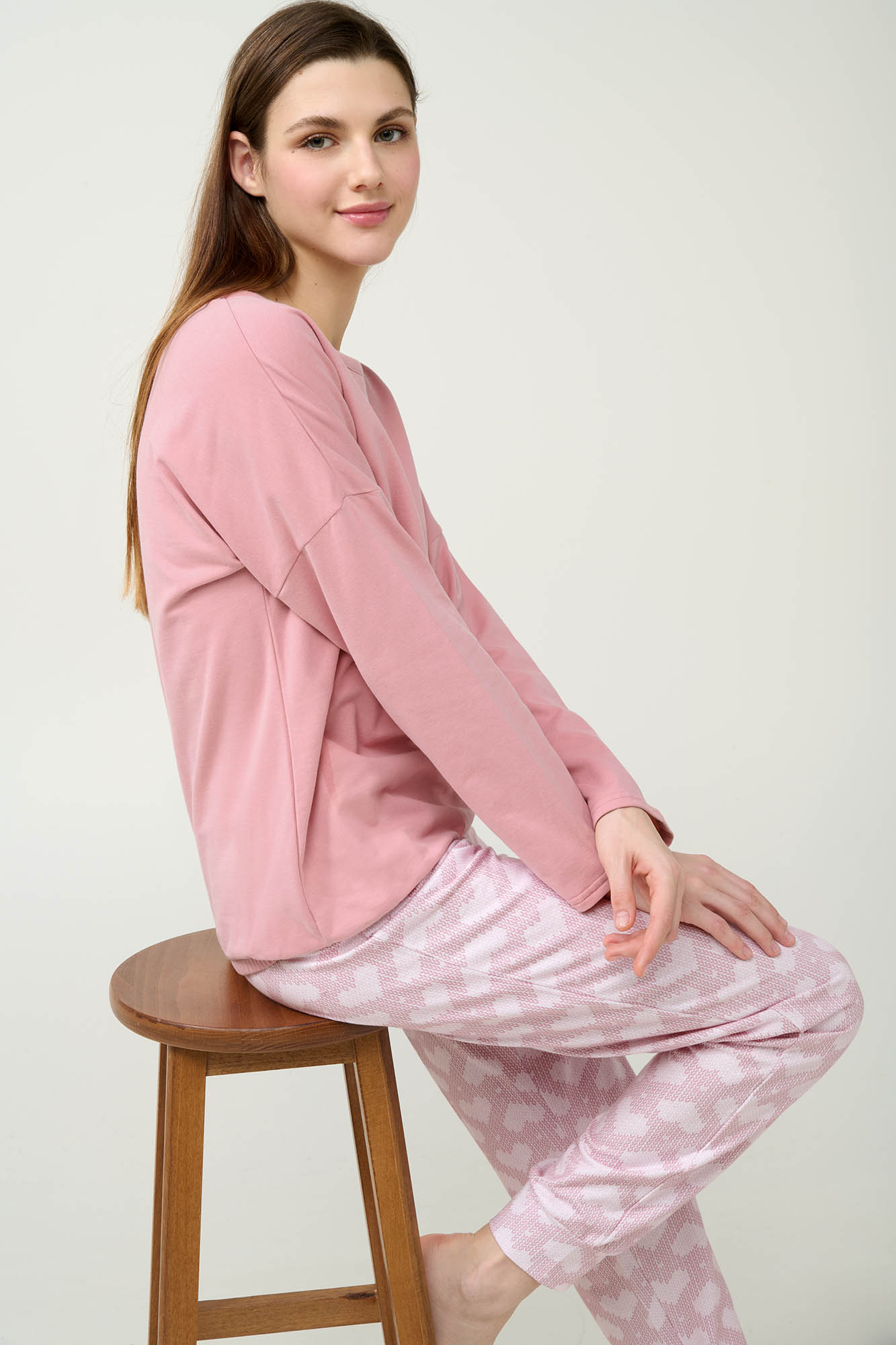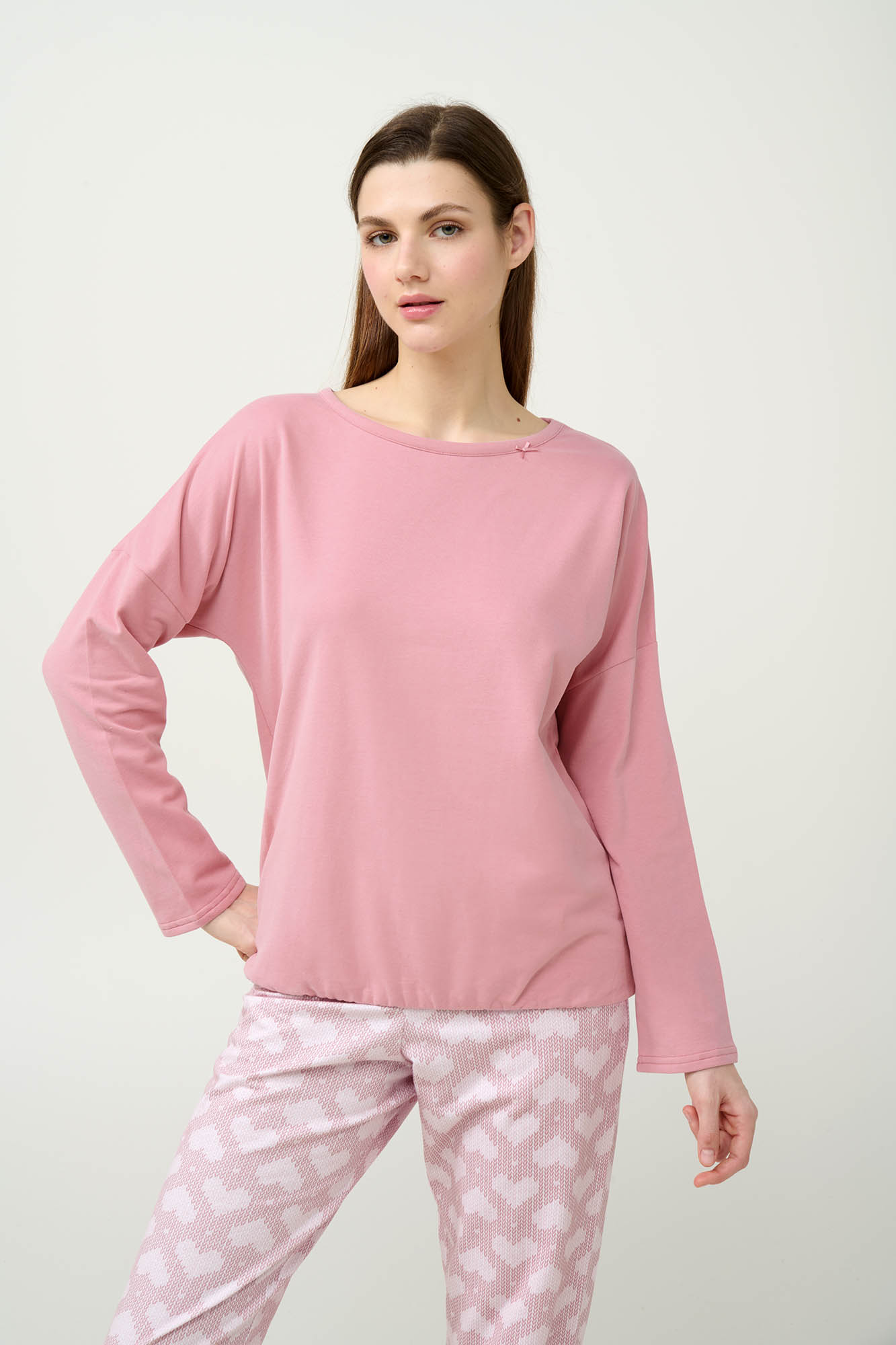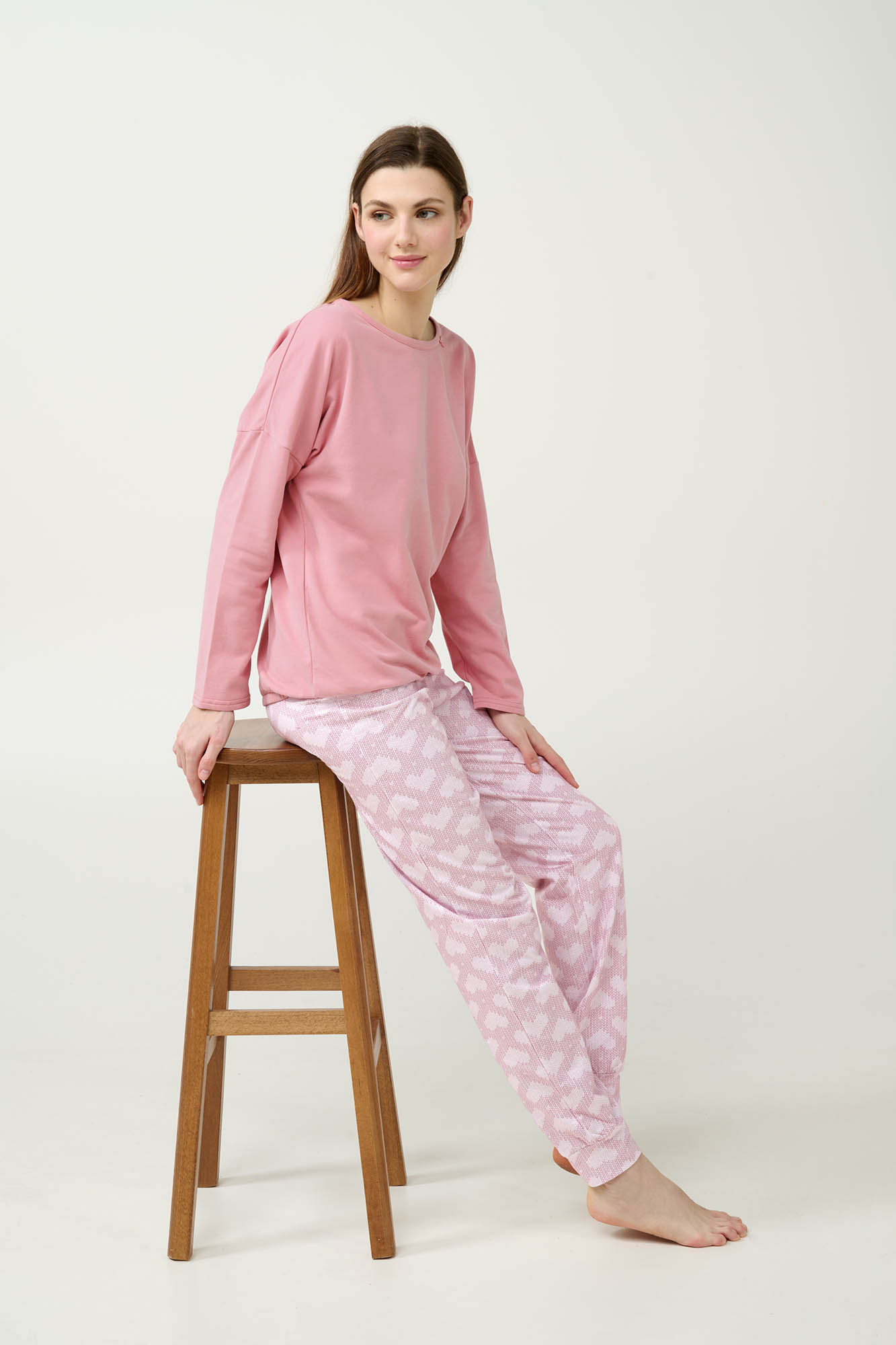 Αγκαλιάστε την άνεση και τη γοητεία που χαρίζει αυτό το σετ χειμερινές γυναικείες πυτζάμες, κατασκευασμένες από 100% βαμβάκι φούτερ που προσφέρει απαλή και ζεστή αίσθηση. Αποτελείται από παντελόνι με μανσέτες και μια παιχνιδιάρικη παραλλαγή του διαχρονικού pied de poule για μια μοντέρνα και ρομαντική πινελιά. Το μονόχρωμο πάνω μέρος διαθέτει μακριά μανίκια και ελαστική μέση για καλύτερη εφαρμογή και άνεση. Ένα cozy κομμάτι, ιδανικό για στιγμές χαλάρωσης ή του βραδινού σας ύπνου.