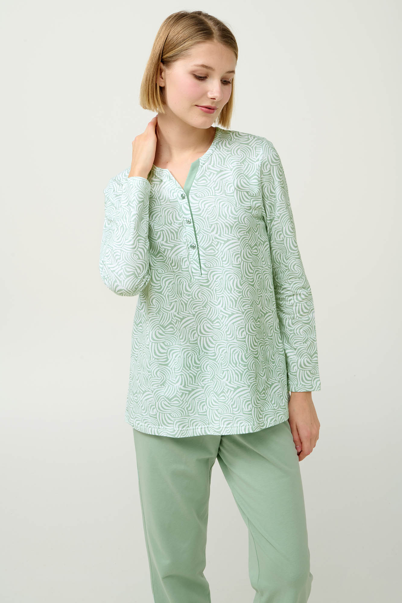 Απολαύστε τον ιδανικό συνδυασμό άνεσης και στυλ με αυτές τις χειμερινές γυναικείες πυτζάμες, κατασκευασμένες από 100% απαλό βαμβάκι φούτερ που προσφέρει ζεστή αίσθηση και διαπνοή. Το πάνω μέρος διαθέτει πατιλέτα και απαλό πράσινο μοτίβο εμπνευσμένο από ζέβρα, προσθέτοντας μια διακριτική αλλά διαχρονική νότα. Συνδυάζεται με μονόχρωμο παντελόνι για ένα καθαρό και ισορροπημένο look. Ιδανικό για τις στιγμές χαλάρωσης σας.