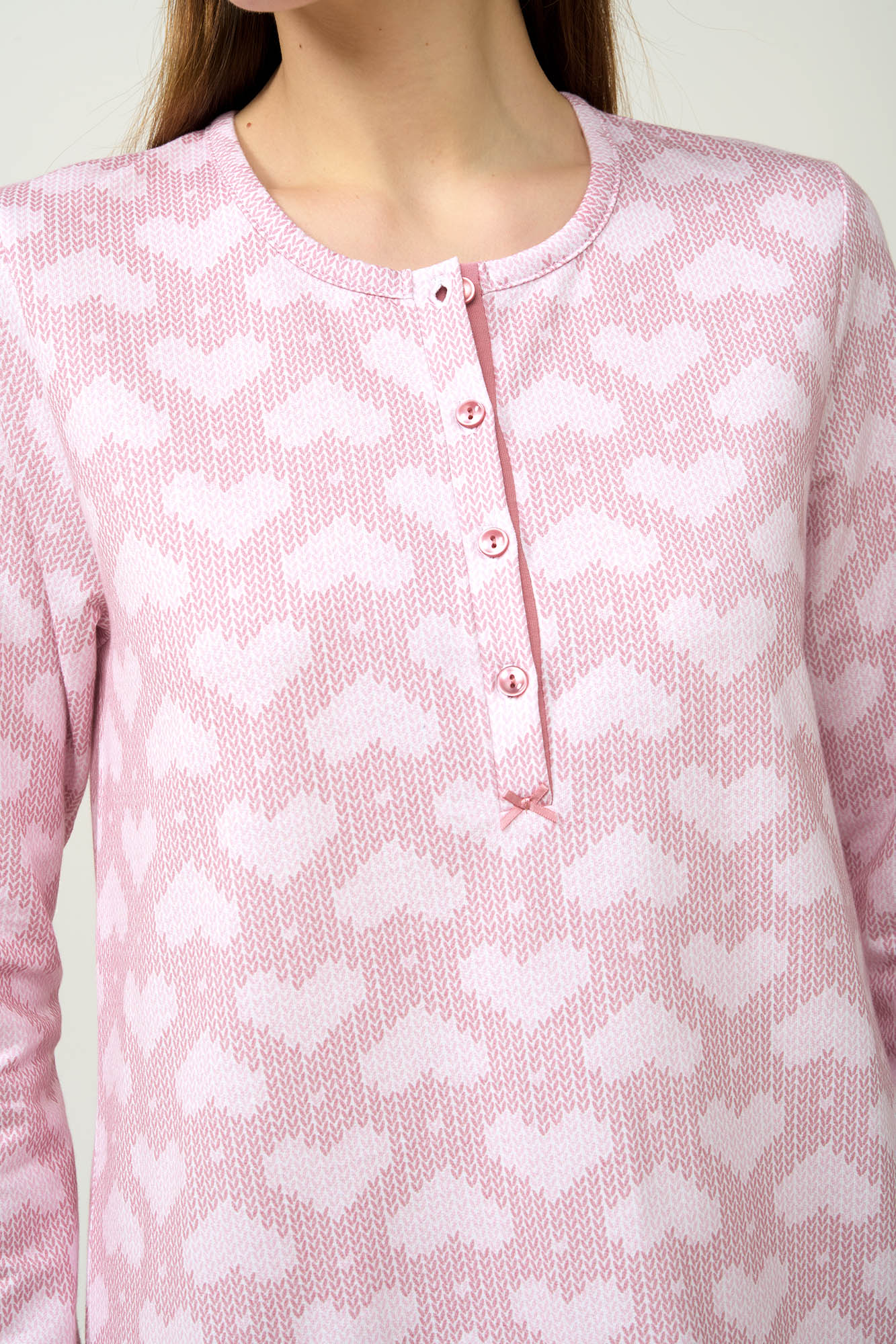 Ανακαλύψτε την άνεση και τη γοητεία που προσφέρουν αυτές οι χειμερινές γυναικείες πυτζάμες, φτιαγμένες από 100% φούτερ βαμβάκι που χαρίζει απαλή και ζεστή αίσθηση στο σώμα. Το επάνω μέρος διαθέτει πατιλέτα και μια ανανεωμένη εκδοχή του κλασικού pied de poule, που σχηματίζει καρδιές, προσφέροντας έναν συνδυασμό διαχρονικού και μοντέρνου στυλ. Συνδυασμένο με μονόχρωμο παντελόνι που χαρίζει ισορροπία στο σύνολο . Ιδανικό για στιγμές χαλάρωσης ή έναν ήρεμο ύπνο.