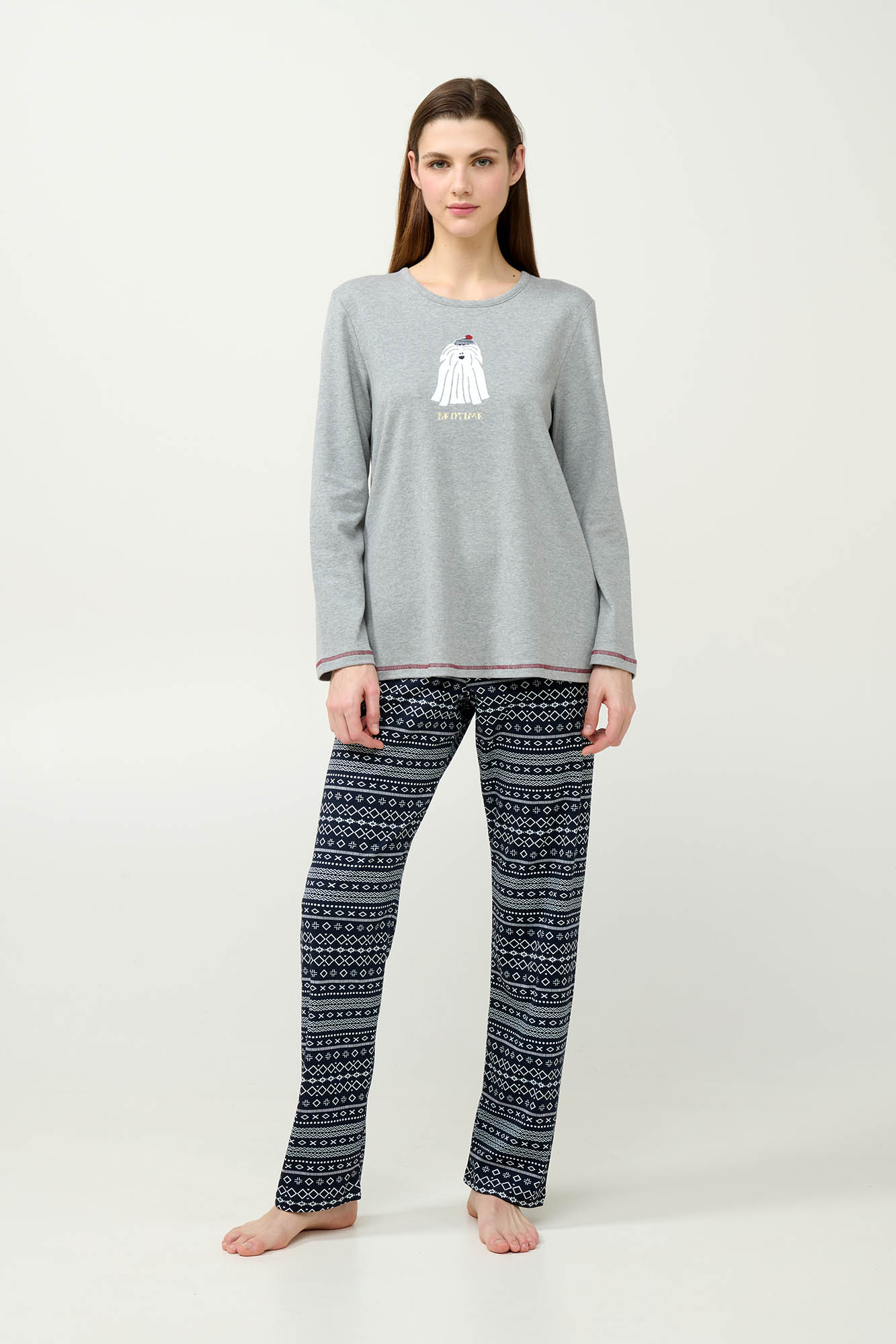 Ανακαλύψτε την απόλυτη άνεση με αυτές τις χειμερινές γυναικείες πυτζάμες, φτιαγμένες από 100% απαλό και διαπνέον βαμβάκι interlock. Το σετ περιλαμβάνει ένα ζεστό τοπ με μακριά μανίκια και ένα χαριτωμένο τύπωμα στο στήθος, που συνδυάζεται με μακρύ παντελόνι σε γεωμετρικό σχέδιο εμπνευσμένο από σκανδιναβικό μοτίβο. Ιδανικές για χαλάρωση στο σπίτι ή για ύπνο, αυτές οι πυτζάμες συνδυάζουν χαρούμενη γοητεία με καθημερινή άνεση.