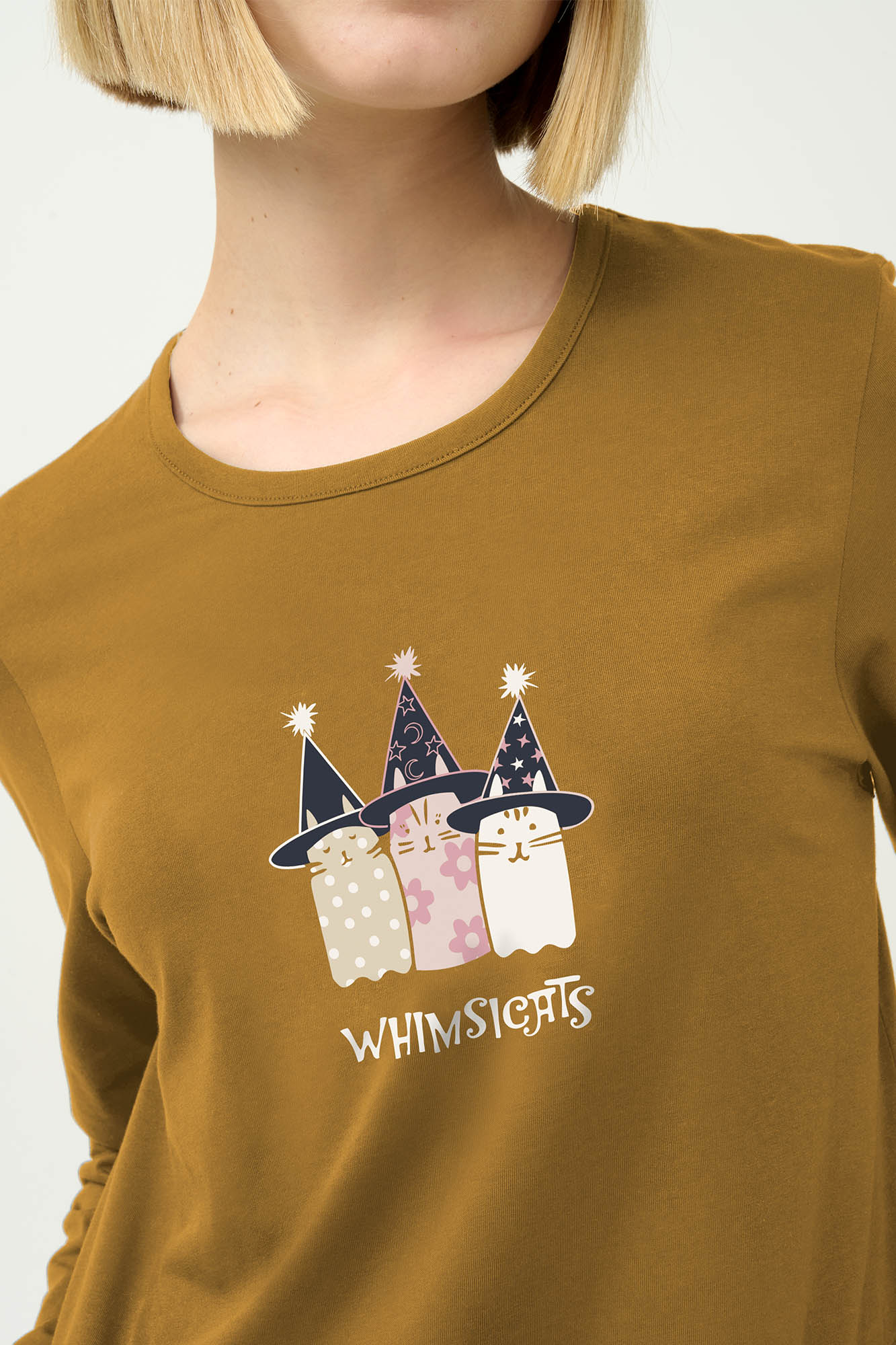 Αφεθείτε σε ζεστές χειμερινές νύχτες με αυτές τις γυναικείες πυτζάμες, από 100% διαπνέον βαμβάκι s. jersey. Η μακρυμάνικη μπλούζα με μανσέτες διακοσμείται με ένα παιχνιδιάρικο τύπωμα από μαγικές γάτες με μυτερά καπέλα, προσθέτοντας μια παραμυθένια και ευχάριστη πινελιά στη βραδινή σας ρουτίνα. Συνδυάζεται με μονόχρωμο παντελόνι με μανσέτες. Απαλές, άνετες και ιδανικές για χαλάρωση στο σπίτι ή έναν ήρεμο ύπνο.