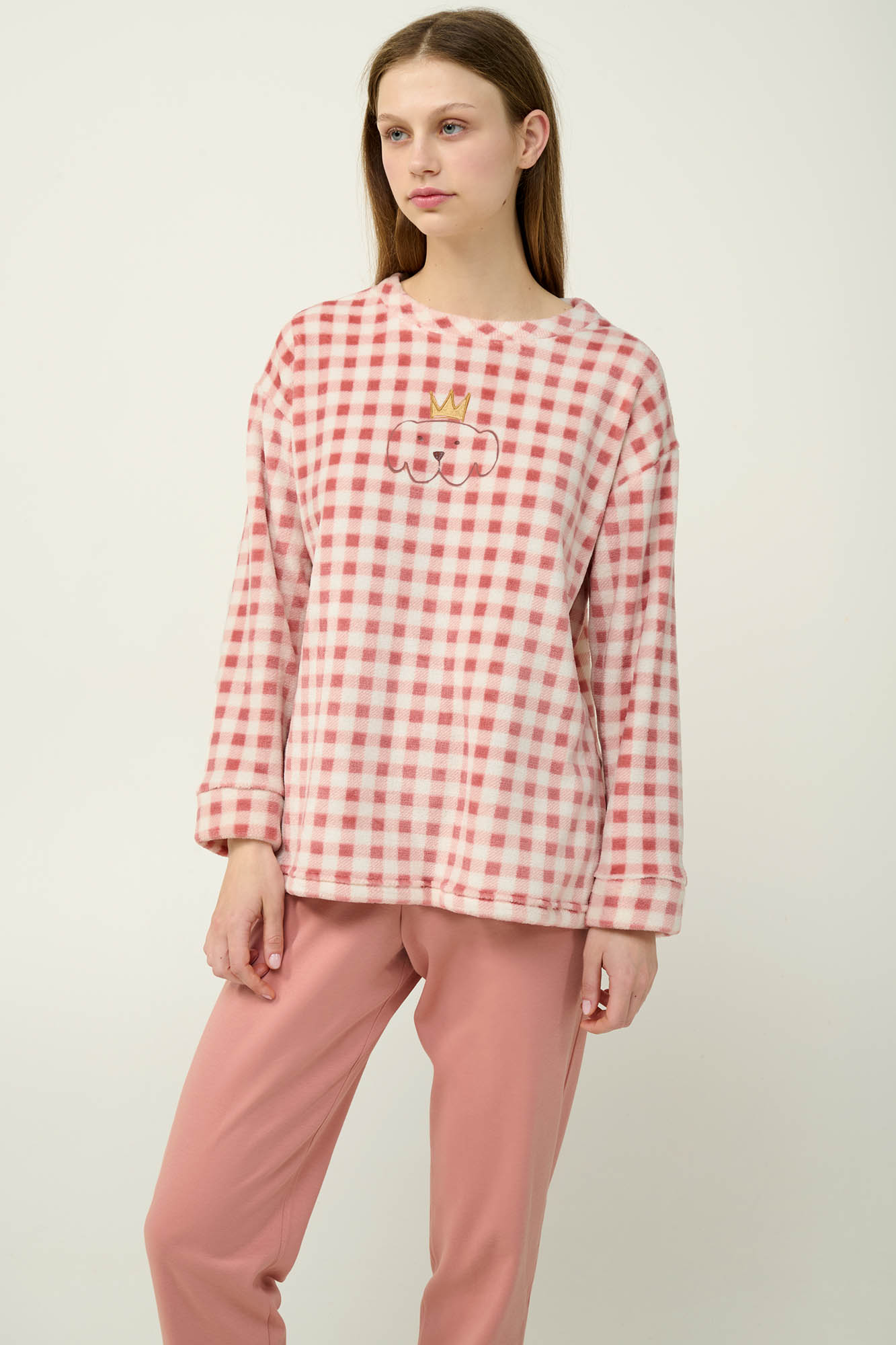 Απολαύστε στιγμές χαλάρωσης με ένα σετ χειμερινές γυναικείες πυτζάμες με απαλή και ζεστή αίσθηση στο σώμα. Αποτελείται από fleece μπλούζα σε ροζ καρό μοτίβο, με μανσέτες και κέντημα στο στήθος. Το σετ συμπληρώνει ένα μονόχρωμο παντελόνι με μανσέτες κατασκευασμένο από 100% βαμβάκι interlock. Μια ιδανική επιλογή για τις κρύες ημέρες του χειμώνα.