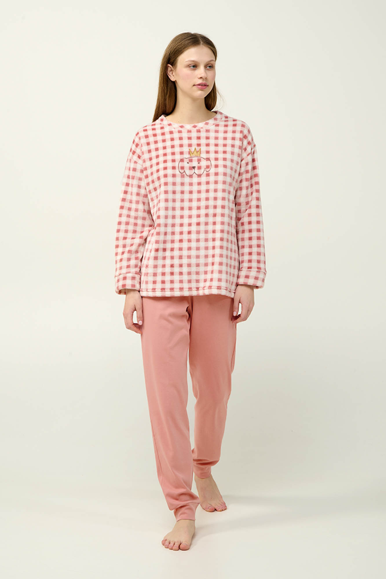 Απολαύστε στιγμές χαλάρωσης με ένα σετ χειμερινές γυναικείες πυτζάμες με απαλή και ζεστή αίσθηση στο σώμα. Αποτελείται από fleece μπλούζα σε ροζ καρό μοτίβο, με μανσέτες και κέντημα στο στήθος. Το σετ συμπληρώνει ένα μονόχρωμο παντελόνι με μανσέτες κατασκευασμένο από 100% βαμβάκι interlock. Μια ιδανική επιλογή για τις κρύες ημέρες του χειμώνα.