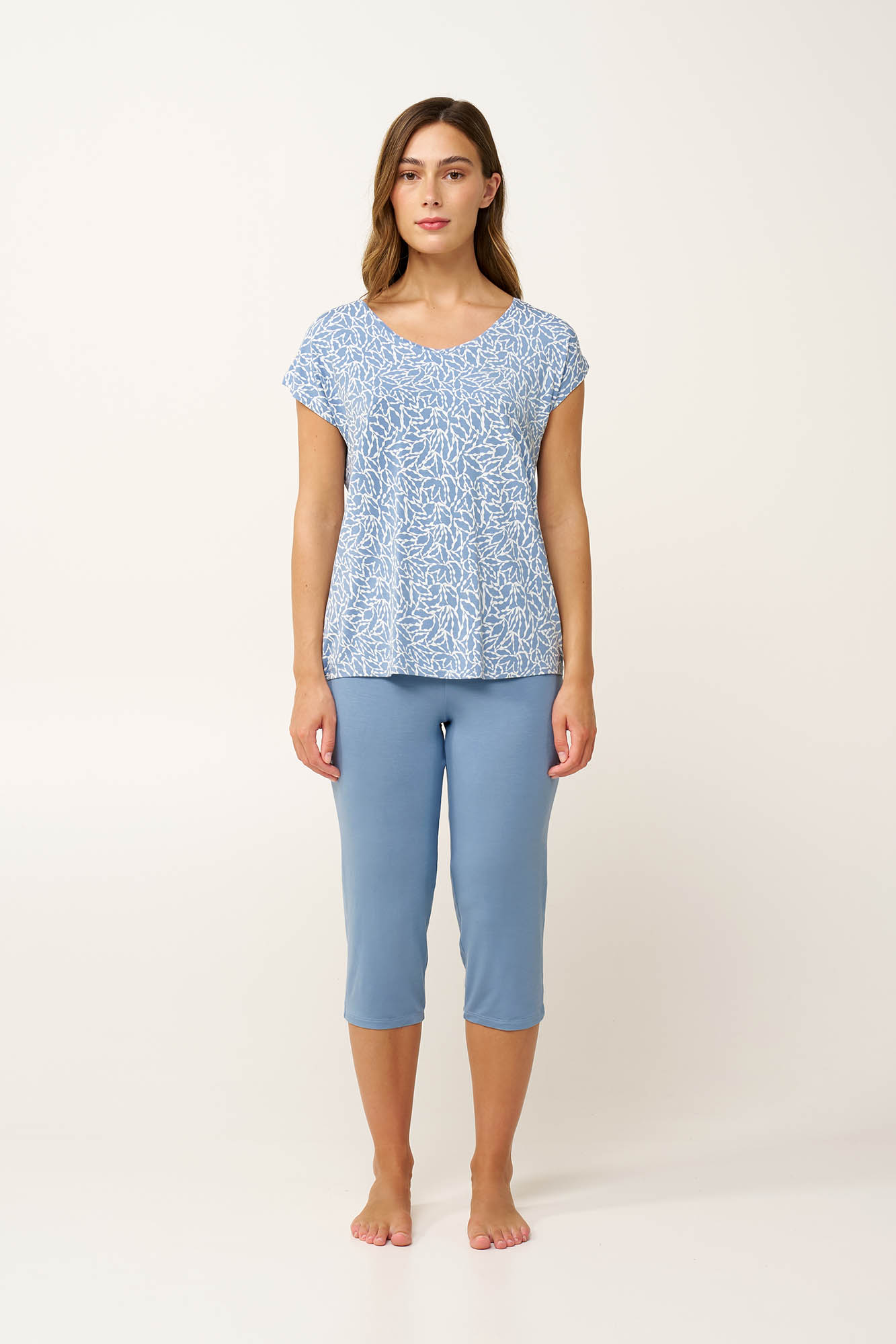 Ανακαλύψτε τον ιδανικό συνδυασμό άνεσης και κομψότητας με αυτή τη γυναικεία πυτζάμα. Κατασκευασμένη από διαπνέον LENZING Tencel Modal Micro, προσφέρει απαλή και δροσερή αίσθηση, ιδανική για ζεστές νύχτες. Η μπλούζα ξεχωρίζει με ένα μοτίβο φύλλων σε απαλούς μπλε τόνους και λευκές λεπτομέρειες, χαρίζοντας φρεσκάδα, ενώ το μονόχρωμο κάπρι παντελόνι διατηρεί το σύνολο ισορροπημένο και διαχρονικό. Με χαλαρή εφαρμογή που επιτρέπει ελευθερία κινήσεων, αυτό το σετ είναι ιδανικό για χαλάρωση ή έναν άνετο ύπνο.