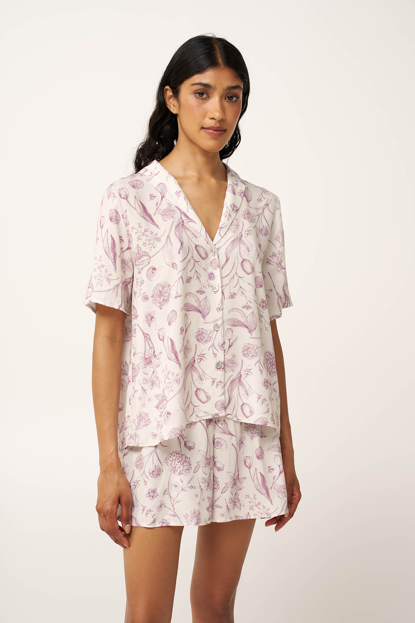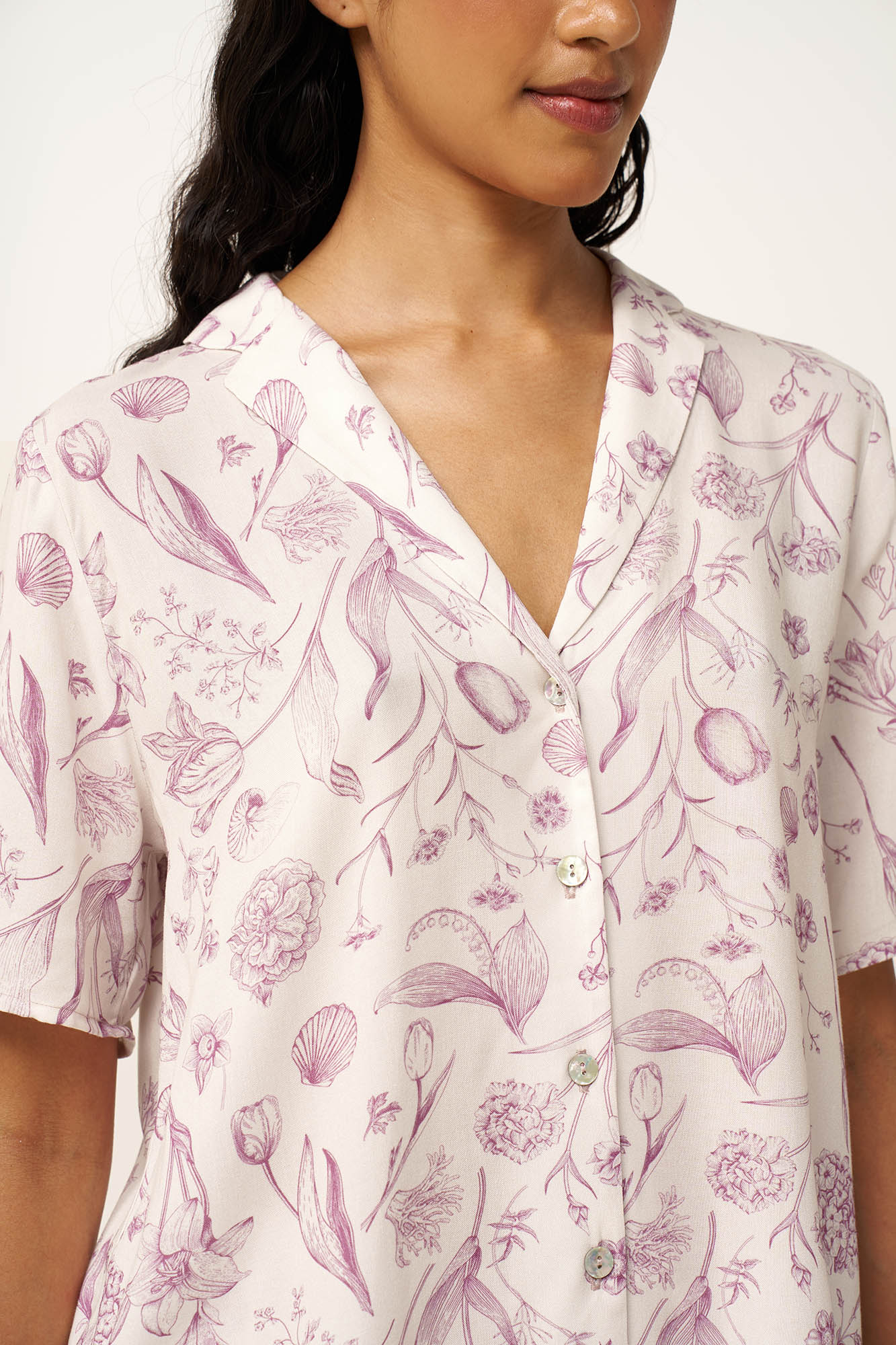 Απολαύστε κάθε στιγμή του καλοκαιριού με ένα σετ γυναικείες πυτζάμες, από viscose ποπλίνα που αγγίζει απαλά το σώμα. Το σετ αποτελείται από κοντομάνικο, κουμπωτό τοπ και ένα κοντό παντελόνι σε χαλαρή γραμμή, που είναι σχεδιασμένα με ένα λεπτεπίλεπτο απαλό ροζ, φλοράλ μοτίβο, δημιουργώντας μια ήρεμη και θηλυκή αίσθηση. Ιδανικό για ζεστές νύχτες, ξεκούραστο ύπνο ή αργά, χαλαρά πρωινά στο σπίτι, αυτό το σετ συνδυάζει άνεση, διακριτικό ρομαντισμό και διαχρονικότητα.