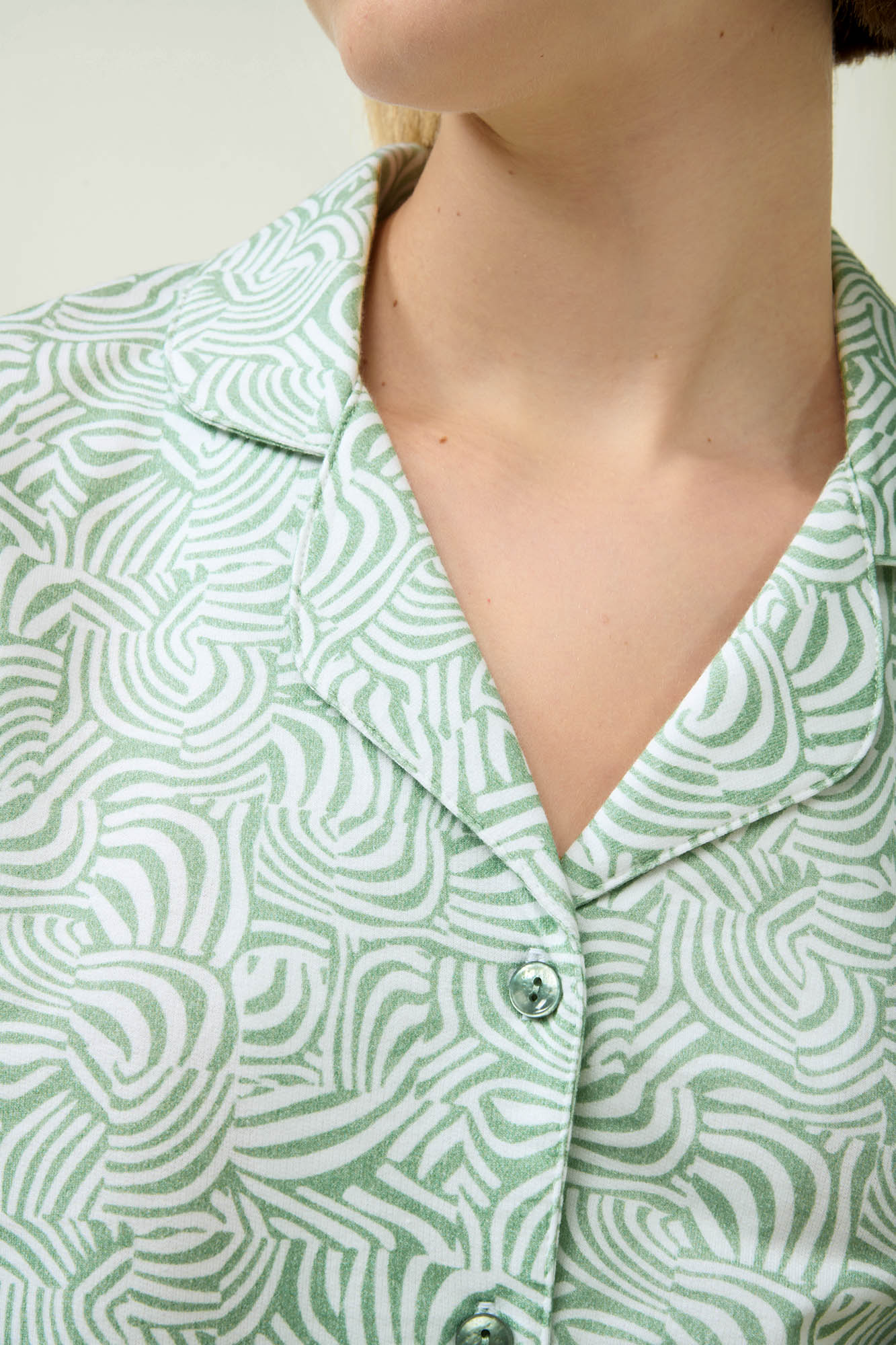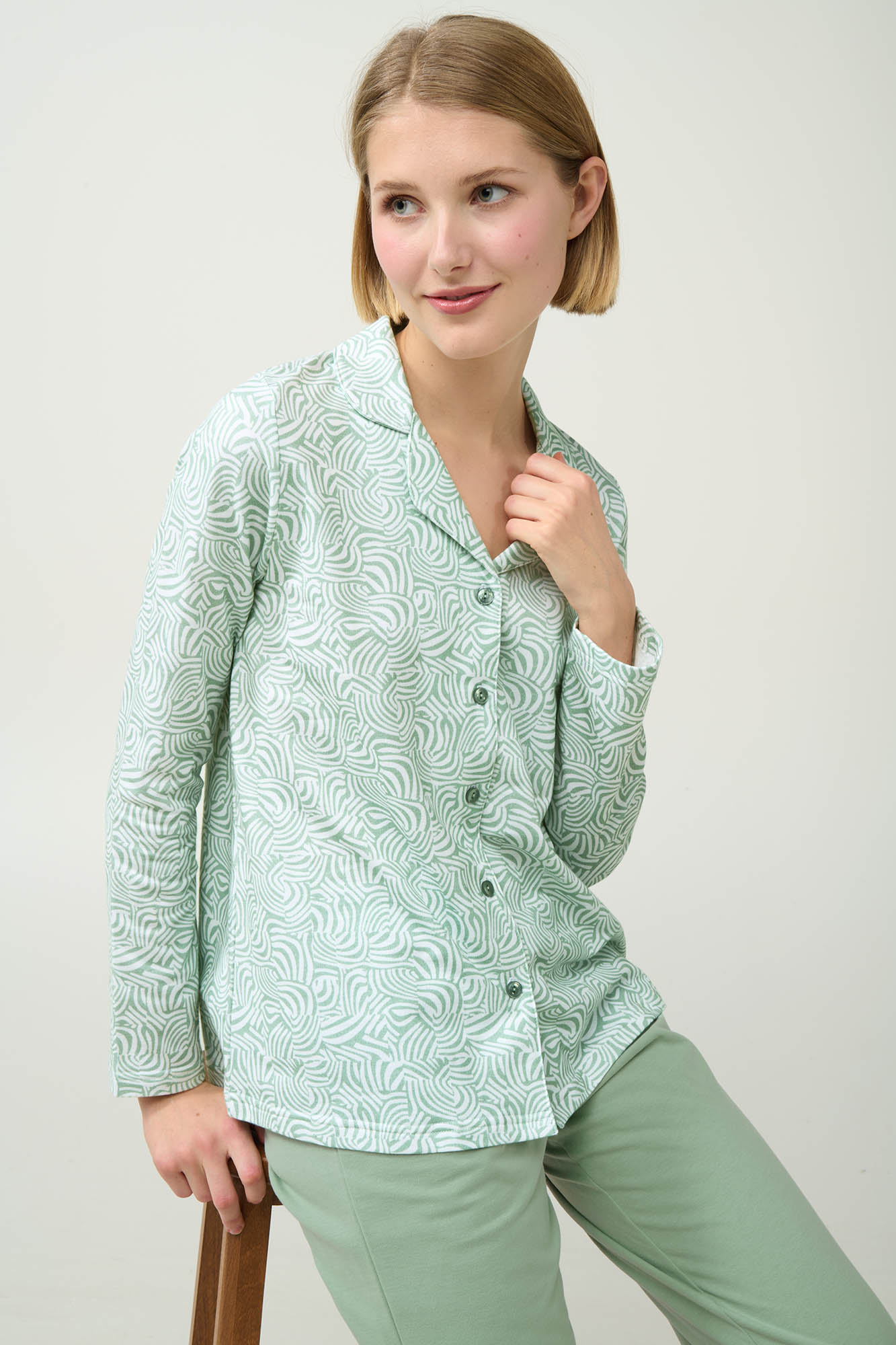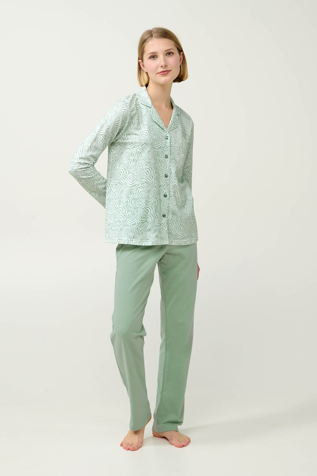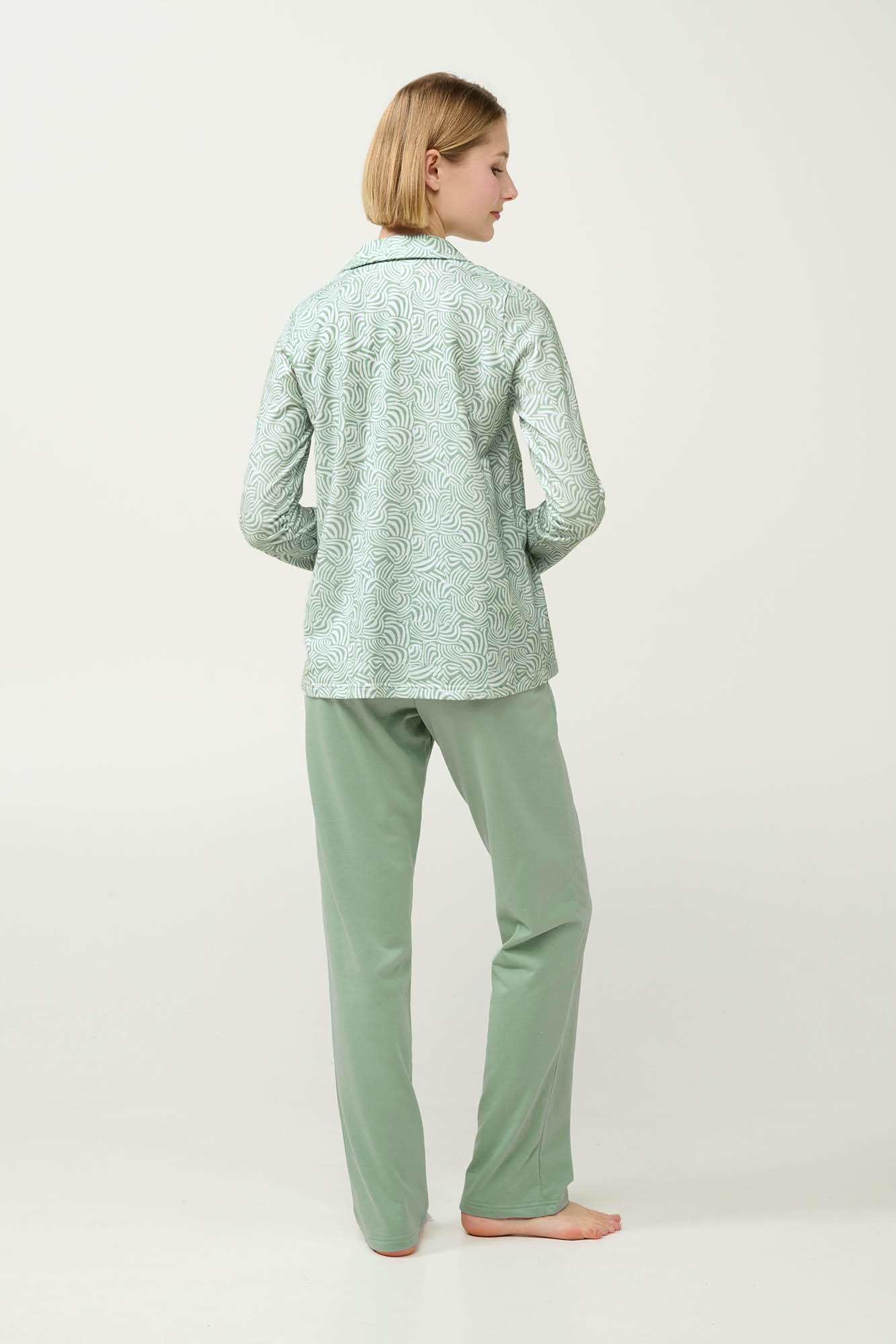 Προσθέστε μια νότα ανανέωσης στις στιγμές χαλάρωσης σας με αυτές τις γοητευτικές γυναικείες πυτζάμες, κατασκευασμένες από 100% απαλό και ζεστό βαμβάκι φούτερ. Αποτελείται από κλασικό κουμπωτό πάνω μέρος σε ένα απαλό πράσινο μοτίβο εμπνευσμένο από ζέβρα, συνδυάζοντας την άνεση και διαχρονική κομψότητα. Το σετ συμπληρώνει ένα μονόχρωμο παντελόνι, που χαρίζει ισορροπία στο σύνολο. Ιδανικό για ήσυχα βράδια και ξεκούραστο ύπνο.