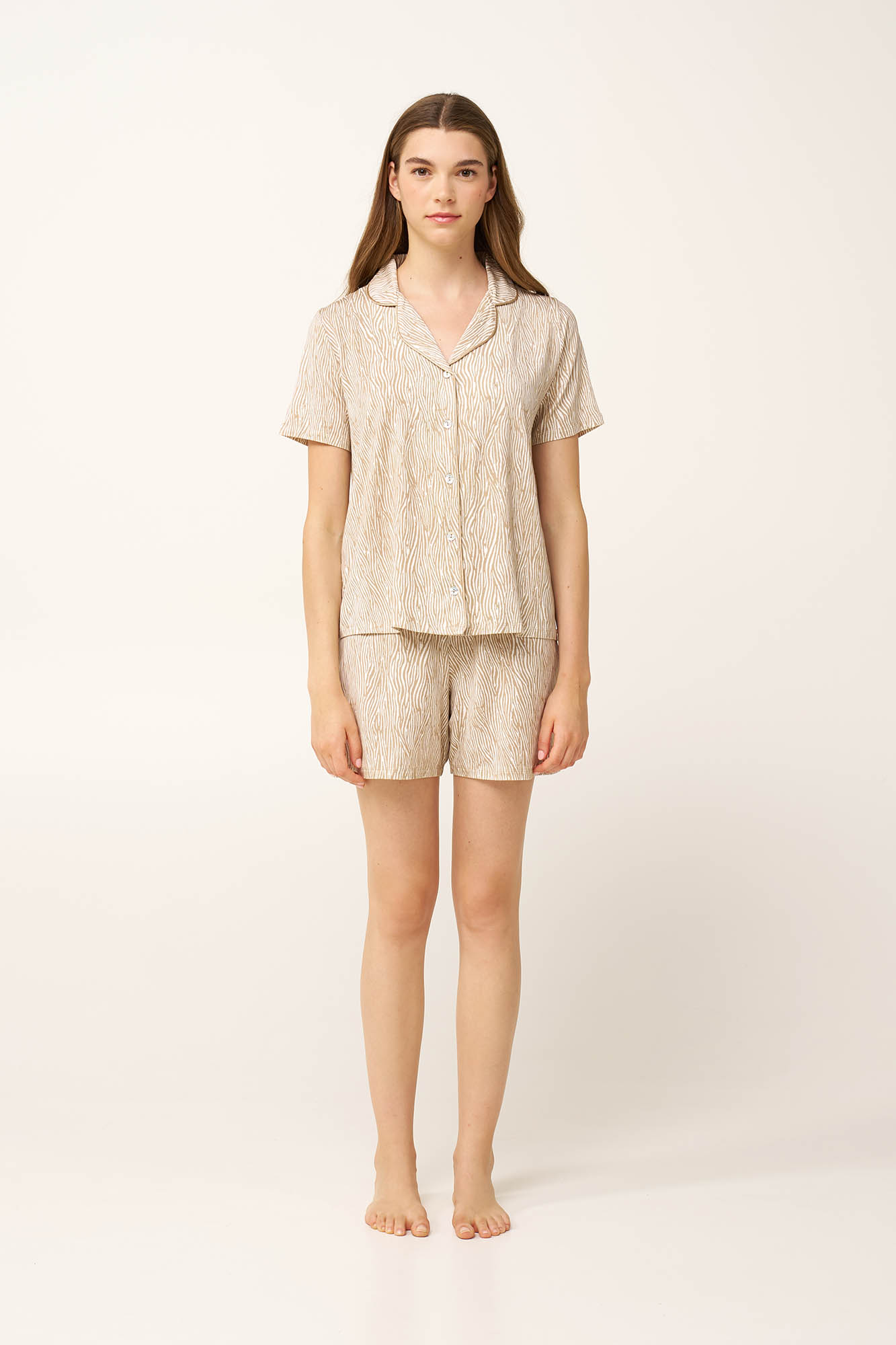 Ανακαλύψτε τον ιδανικό συνδυασμό άνεσης και γοητείας με αυτές τις καλοκαιρινές γυναικείες πυτζάμες με ζέβρα μοτίβο, κατασκευασμένες από εξαιρετικά απαλό και διαπνέον LENZING Tencel Modal Micro και elastane. Το κλασικό κουμπωτό πάνω μέρος με κοντά μανίκια, συνδυάζεται αρμονικά με ένα άνετο κοντό παντελόνι , για να προσφέρει ευχάριστη αίσθηση, δροσερή αίσθηση τις ζεστές καλοκαιρινές νύχτες.