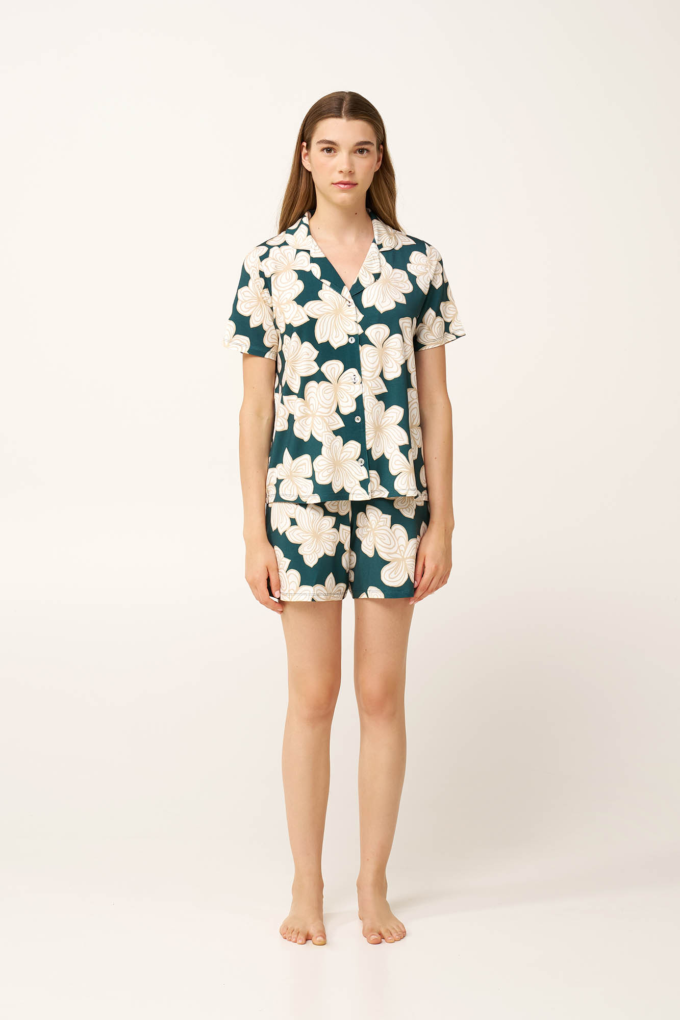 Προσθέστε στη συλλογή σας ένα σετ καλοκαιρινές γυναικείες πυτζάμες που συνδυάζει κομψότητα και άνεση. Είναι κατασκευασμένο από LENZING Tencel Modal Micro,που αγκαλιάζει ευχάριστα το σώμα, προσφέροντας μοναδικά απαλή υφή και διαπνοή. Είναι σχεδιασμένο με κλασικό κουμπωτό πάνω μέρος, κοντά μανίκια και σορτς σε φλοράλ μοτίβο για δροσερή αίσθηση. Ιδανική επιλογή για τις στιγμές χαλάρωσης σας στο σπίτι ή τον βραδινό ύπνο.