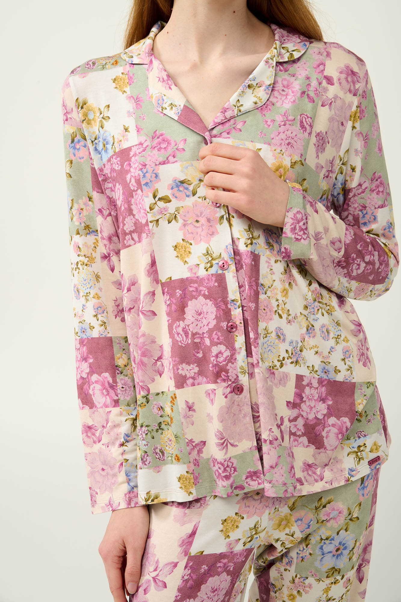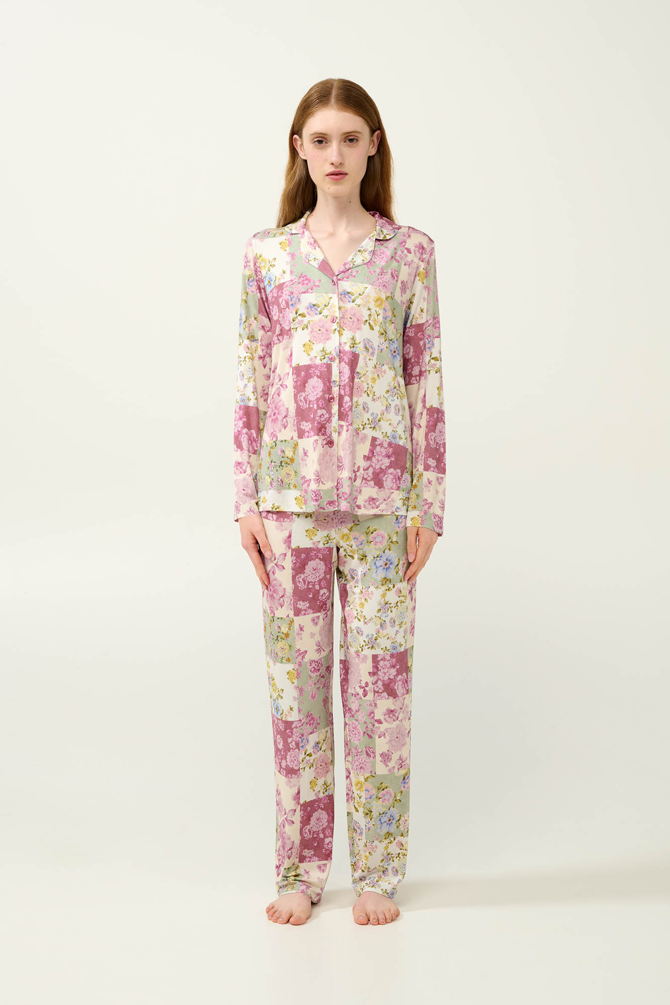 Επιλέξτε ένα σετ χειμερινές γυναικείες πυτζάμες με patchwork φλοράλ μοτίβο που αποπνέει θηλυκότητα και ρομαντισμό. Είναι σχεδιασμένο με κλασικό κουμπωτό πάνω μέρος που προσθέτει διαχρονική κομψότητα στο σύνολο. Το σετ είναι κατασκευασμένο από εξαιρετικά απαλό στο δέρμα LENZING Tencel Modal Micro για να απολαύσετε κάθε στιγμή με άνεση και μια αίσθηση πολυτέλειας.