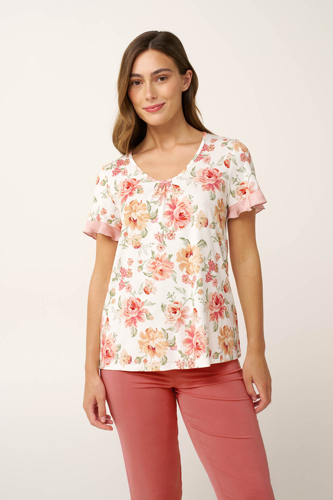 Επιλέξτε ένα σετ καλοκαιρινές γυναικείες πυτζάμες από απαλό LENZING Tencel Modal Micro, που προσφέρει ανάλαφρη, διαπνέουσα αίσθηση στο σώμα. Αποτελείται από τοπ με σούρες στο στήθος, ρομαντικές σιφόν λεπτομέρειες στα μανίκια και ένα vintage φλοράλ μοτίβο που ενισχύει τον θηλυκό του χαρακτήρα. Το σετ συμπληρώνει ένα μονόχρωμο κάπρι παντελόνι που χαρίζει ισορροπία στο σύνολο. Ιδανικό για χαλάρωση τις ζεστές ημέρες και έναν άνετο βραδινό ύπνο.