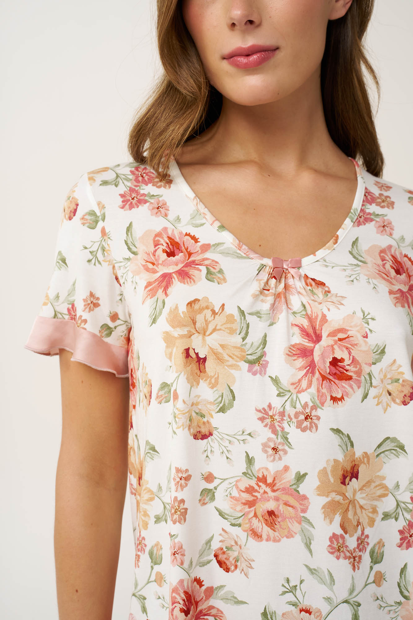 Επιλέξτε ένα σετ καλοκαιρινές γυναικείες πυτζάμες από απαλό LENZING Tencel Modal Micro, που προσφέρει ανάλαφρη, διαπνέουσα αίσθηση στο σώμα. Αποτελείται από τοπ με σούρες στο στήθος, ρομαντικές σιφόν λεπτομέρειες στα μανίκια και ένα vintage φλοράλ μοτίβο που ενισχύει τον θηλυκό του χαρακτήρα. Το σετ συμπληρώνει ένα μονόχρωμο κάπρι παντελόνι που χαρίζει ισορροπία στο σύνολο. Ιδανικό για χαλάρωση τις ζεστές ημέρες και έναν άνετο βραδινό ύπνο.