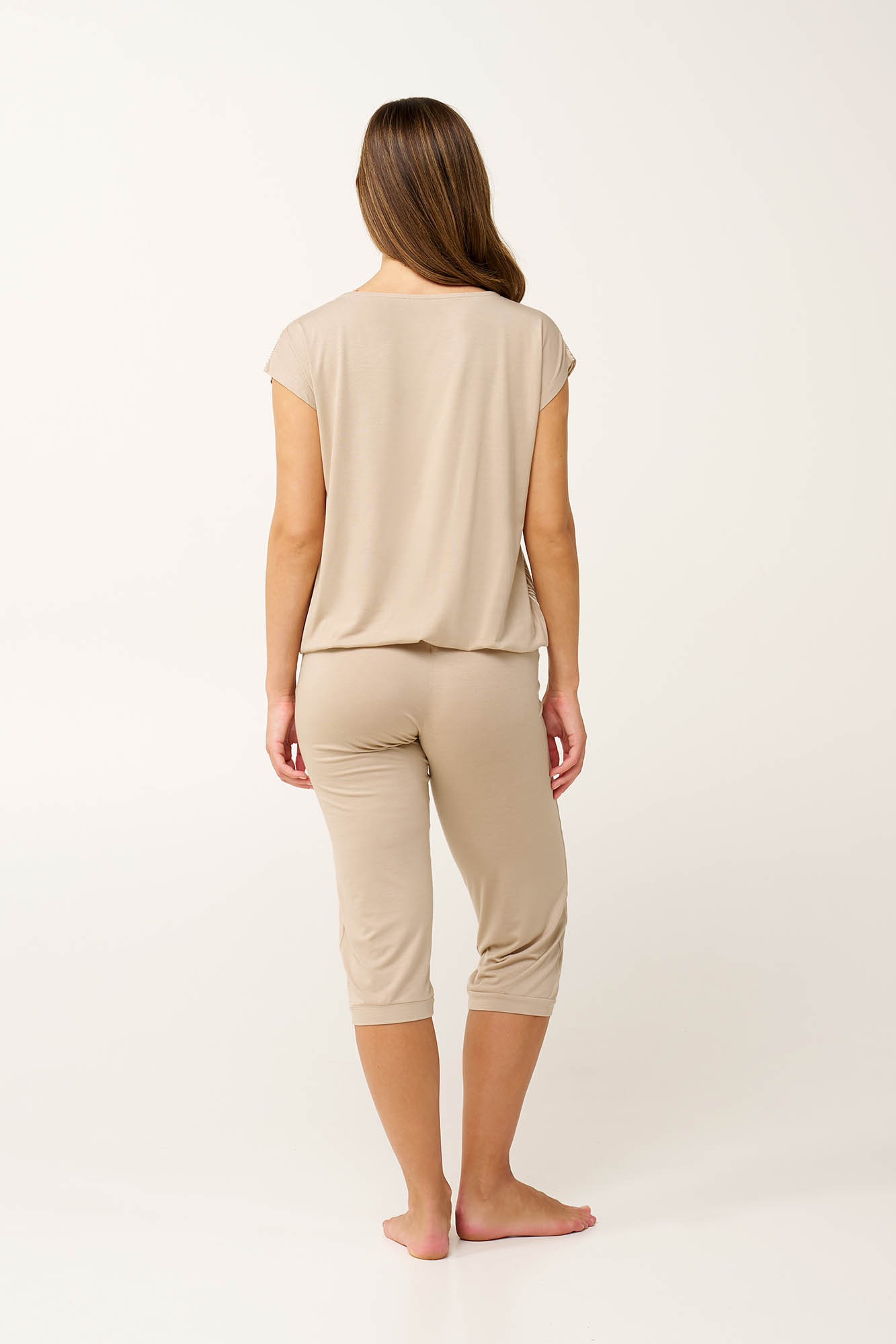 Ανανεώστε τη συλλογή σας με αυτές τις κομψές γυναικείες πυτζάμες, κατασκευασμένες από LENZING Tencel Modal Micro για απαλή, διαπνέουσα και πολυτελή αίσθηση. Αποτελείται από μια μπλούζα με φαρδιά λαιμόκοψη και μοτίβο ζέβρας μπροστά που συνοδεύεται από μονόχρωμο κάπρι παντελόνι Ένα σετ σε γήινες αποχρώσεις για να σας βοηθήσει να χαλαρώσετε και να απολαύσετε κάθε στιγμή στο σπίτι.