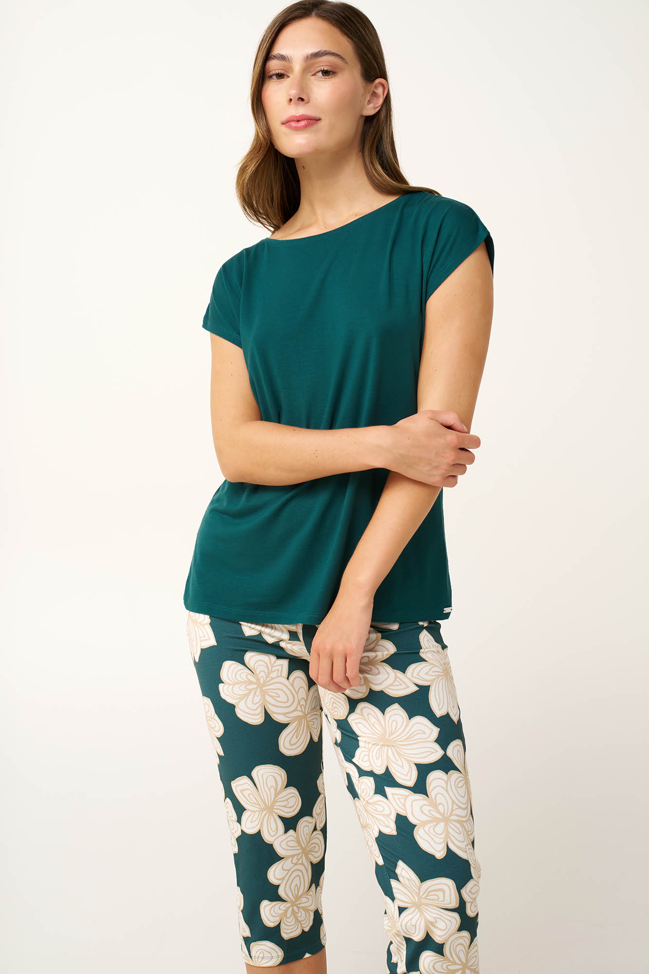 Φωτίστε τις καλοκαιρινές σας νύχτες με αυτό το κομψό σετ γυναικείες πυτζάμες. Αποτελείται από μονόχρωμο τοπ με φαρδιά λαιμόκοψη και κοντά μανίκια που συνοδεύεται από ένα κάπρι παντελόνι σε φλοράλ μοτίβο. Κατασκευασμένο από εξαιρετικά απαλό στην αφή LENZING Tencel Modal Micro, θα σας κρατήσει δροσερή, επιτρέποντας στο σώμα να αναπνέει για να απολαύσετε κάθε στιγμή στο σπίτι.