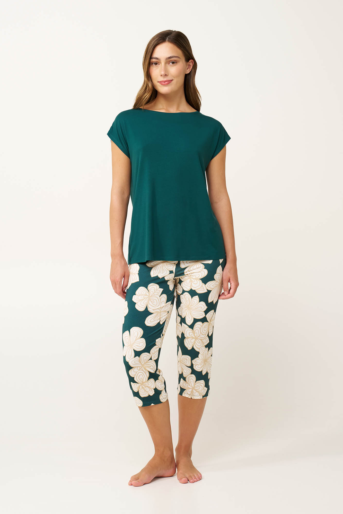 Φωτίστε τις καλοκαιρινές σας νύχτες με αυτό το κομψό σετ γυναικείες πυτζάμες. Αποτελείται από μονόχρωμο τοπ με φαρδιά λαιμόκοψη και κοντά μανίκια που συνοδεύεται από ένα κάπρι παντελόνι σε φλοράλ μοτίβο. Κατασκευασμένο από εξαιρετικά απαλό στην αφή LENZING Tencel Modal Micro, θα σας κρατήσει δροσερή, επιτρέποντας στο σώμα να αναπνέει για να απολαύσετε κάθε στιγμή στο σπίτι.