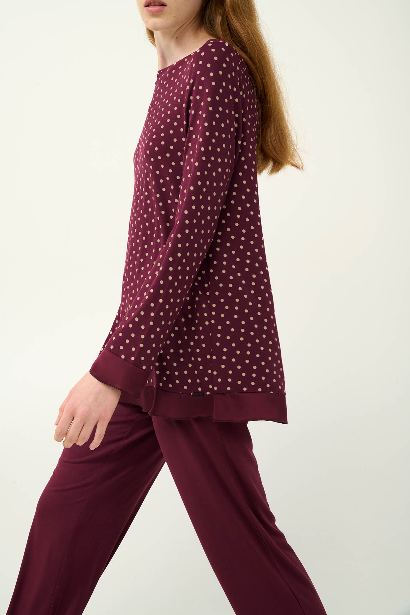 Ανακάλυψε την απόλυτη άνεση με αυτές τις χειμερινές γυναικείες πυτζάμες, φτιαγμένες από εξαιρετικής ποιότητας LENZING Tencel Modal Micro, γνωστό για τη μοναδική απαλότητα και διαπνοή του. Το επάνω μέρος, με μακριά μανίκια και διακριτικό πουά μοτίβο σε μοβ φόντο, προσθέτει μια κλασική νότα, ενώ το μονόχρωμο παντελόνι ολοκληρώνει το σύνολο με διακριτική φινέτσα. Ιδανική επιλογή για χαλάρωση στο σπίτι και έναν ήρεμο ύπνο.
