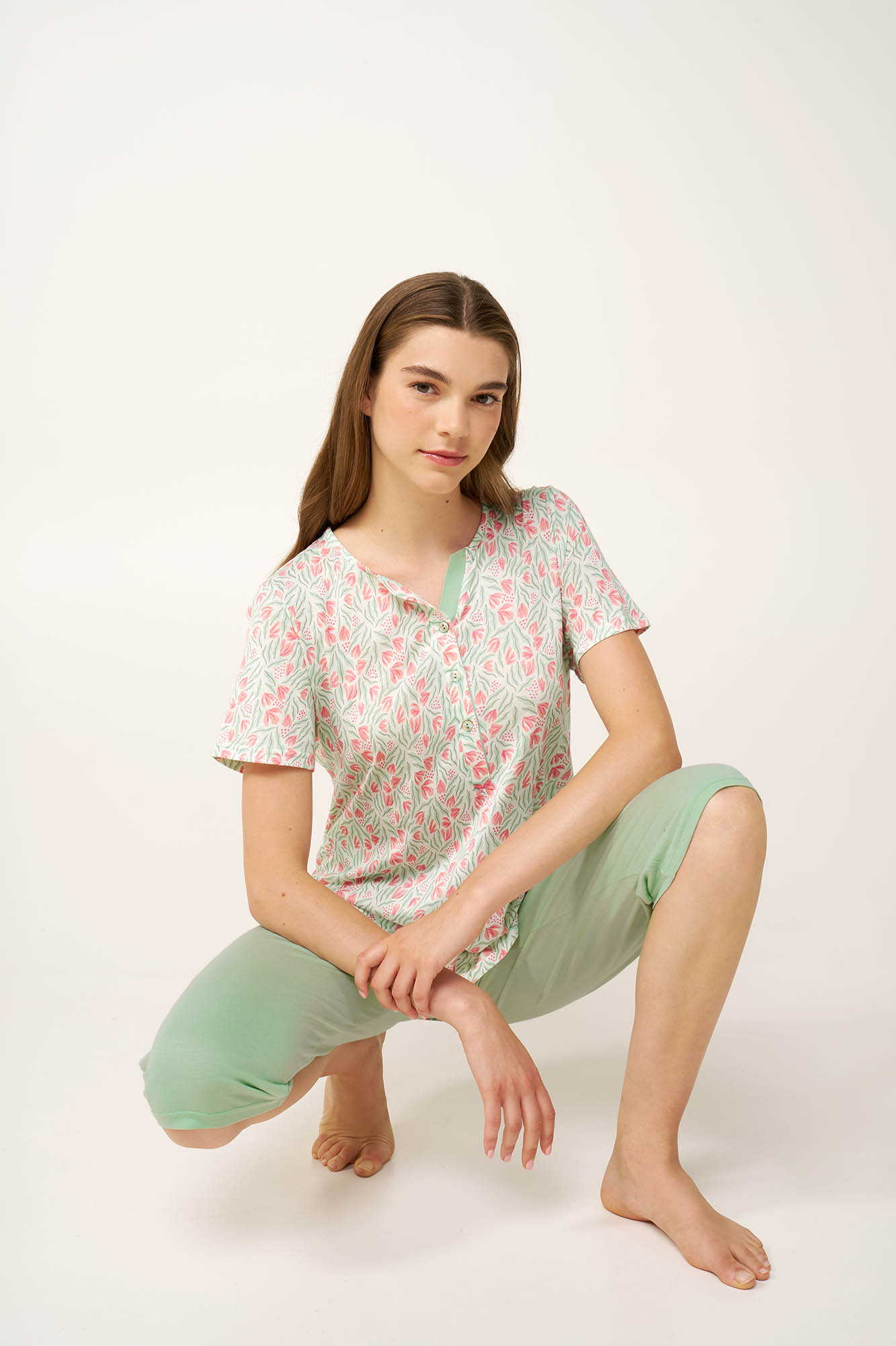 Ανανεώστε την γκαρνταρόμπα σας με αυτή τη γυναικεία πυτζάμα από απαλό και διαπνέον cotton-modal. Αποτελείται από κοντομάνικο τοπ με διακριτικό φλοράλ μοτίβο εμπνευσμένο από ανθισμένους ανοιξιάτικους κήπους και διαθέτει πρακτική πατιλέτα στο στήθος. Το μονόχρωμο κάπρι παντελόνι ισορροπεί το σύνολο. Ένα σετ συνδυάζει φρεσκάδα, απαλότητα και καθημερινή θηλυκή γοητεία, ιδανικό για χαλάρωση, ξεκούραση ή έναν ήρεμο ύπνο.
