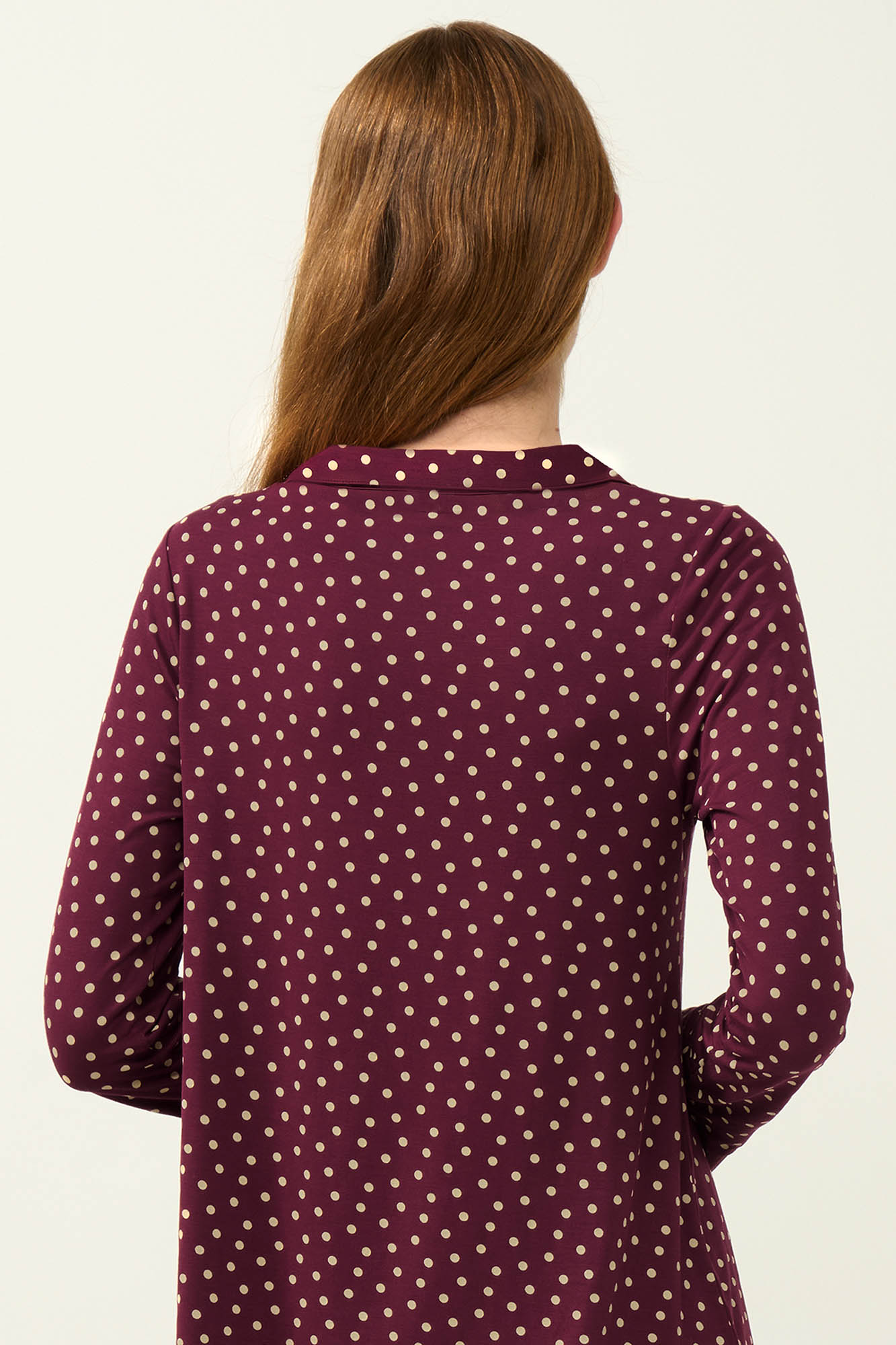Επιλέξτε ένα σετ γυναικείες πυτζάμες που προσφέρει διαχρονική κομψότητα και αίσθηση απαλότητας. Κατασκευασμένο από LENZING Tencel Modal Micro, αγκαλιάζει ευχάριστα το σώμα ενώ επιτρέπει στο δέρμα να αναπνέει. Είναι διακοσμημένο με κλασικό μπεζ πουά μοτίβο σε μοβ φόντο, και το τοπ είναι σχεδιασμένο με κλασικό κουμπωτό μπροστά μέρος. Ένα ιδανικό σετ για να απολαύσετε ένα όμορφο απόγευμα ή το βραδινό σας ύπνο.