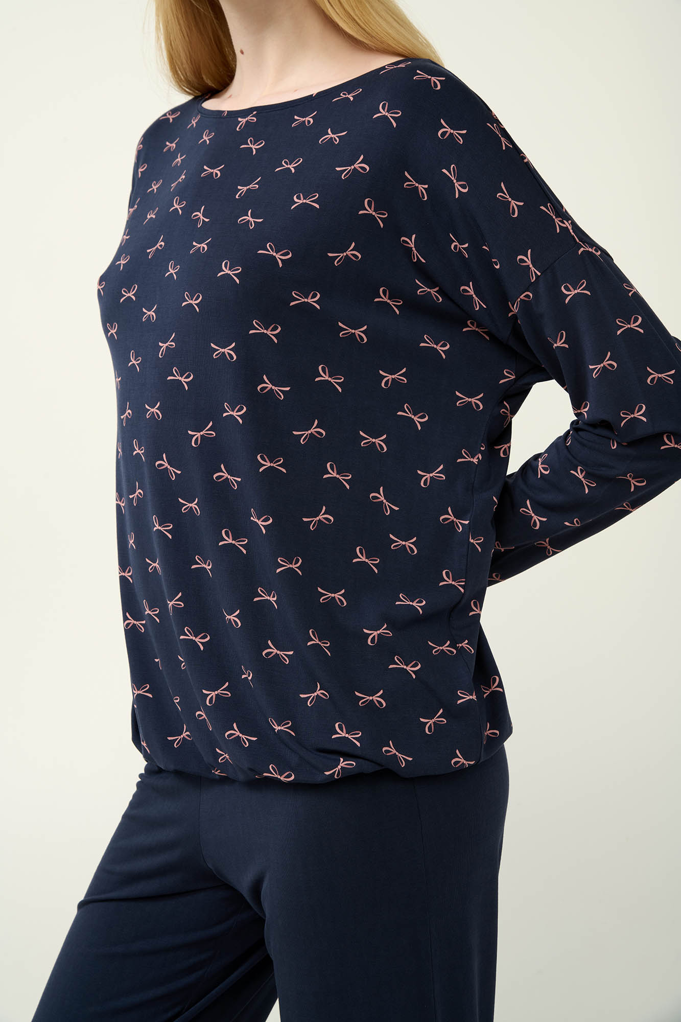 Επιλέξτε για τις στιγμές χαλάρωσης σας ένα σετ χειμερινές γυναικείες πιτζάμες, κατασκευασμένες από υψηλής ποιότητας ύφασμα LENZING Tencel Modal Micro, που προσφέρει εξαιρετικά απαλή αίσθηση στο σώμα. Η μπλούζα με μακριά μανίκια διαθέτει θηλυκή λαιμόκοψη χαμόγελο, λάστιχο στο κάτω μέρος και παιχνιδιάρικο μοτίβο με απαλά ροζ φιογκάκια πάνω σε μπλε καμβά. Συνδυάζεται με μονόχρωμο παντελόνι, με μανσέτες για άνετη εφαρμογή. Ένα σετ που συνδυάζει ρομαντική λεπτομέρεια με καθημερινή πρακτικότητα για να απολαύσετε κάθε στιγμή στο σπίτι.
