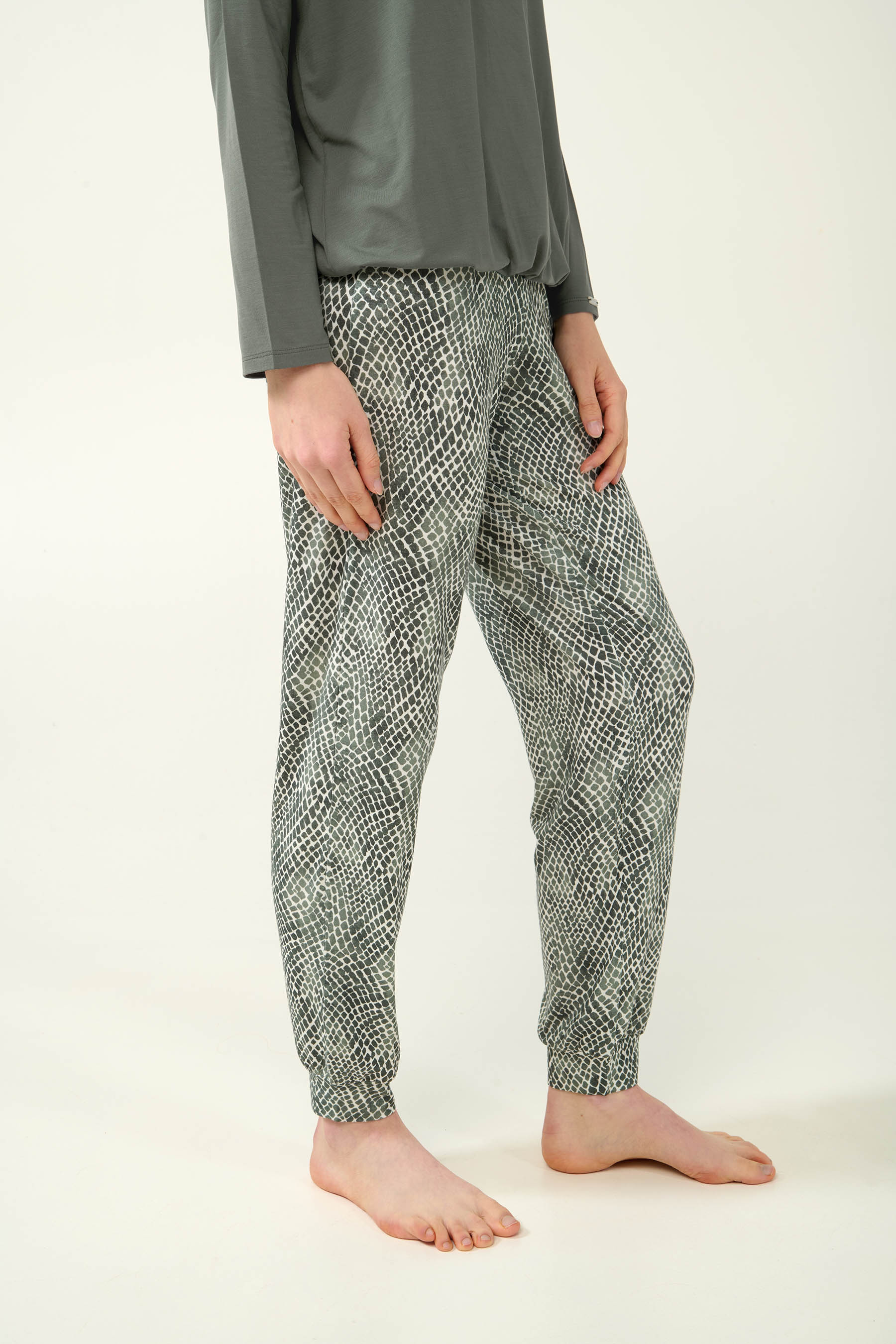 Ανακαλύψτε τον ιδανικό συνδυασμό κομψότητας και άνεσης με ένα σετ γυναικείες πυτζάμες, κατασκευασμένο από LENZING Tencel Modal Micro – ένα εξαιρετικά απαλό ύφασμα που αγκαλιάζει ευχάριστα το σώμα και επιτρέπει στο δέρμα να αναπνέει. Είναι σχεδιασμένο με μακριά μανίκια και λάστιχο στη μέση για σταθερή εφαρμογή, ενώ το παντελόνι διαθέτει εκλεπτυσμένο animal print σε αποχρώσεις του πράσινου ανθρακί και μανσέτες στο τελείωμα. Μια ιδανική επιλογή για τις στιγμές χαλάρωσης στο σπίτι ή τον βραδινό ύπνο.