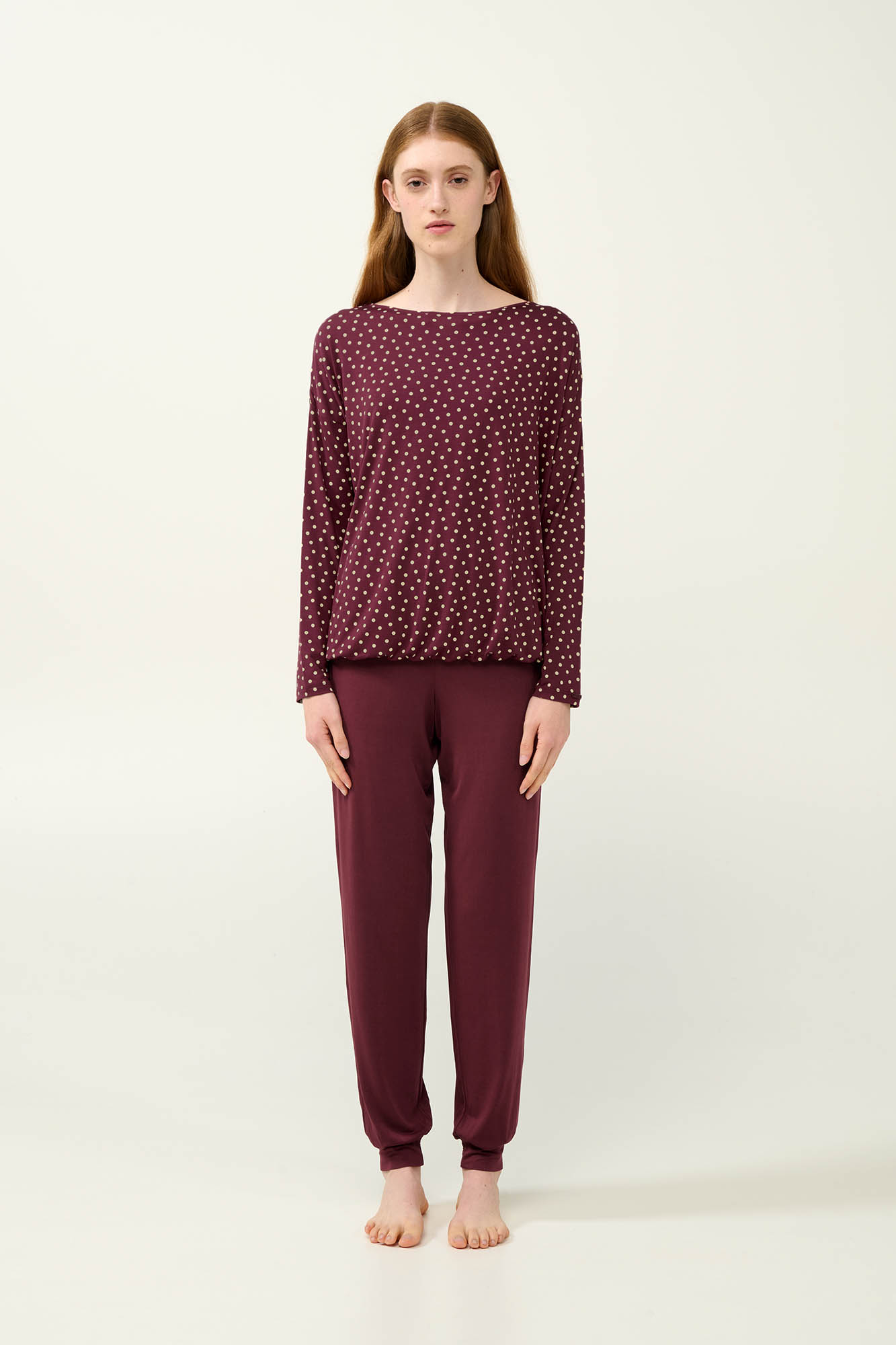 Αφεθείτε στην άνεση και τη απαλή υφή που προσφέρει αυτό το σετ γυναικείες χειμερινές πυτζάμες από LENZING Tencel Modal Micro, ένα ύφασμα που αγκαλιάζει ευχάριστα το σώμα. Η μπλούζα διαθέτει λαιμόκοψη χαμόγελο, λάστιχο στη μέση για πιο βέλτιστη εφαρμογή και είναι διακοσμημένη με διαχρονικό μπεζ πουά μοτίβο σε μοβ φόντο. Το σετ συμπληρώνει ένα μονόχρωμο παντελόνι, με μανσέτες στο τελείωμα για άνετη εφαρμογή. Ένα κομψό και πρακτικό σύνολο, ιδανικό για τις χαλαρές στιγμές του χειμώνα.
