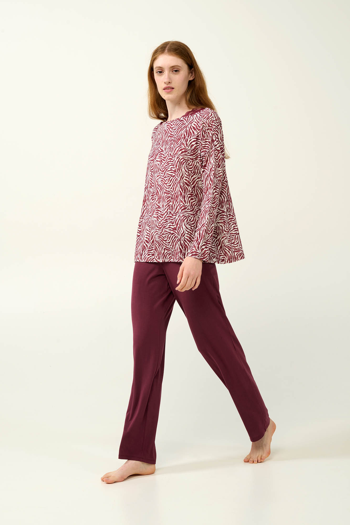 Απολαύστε την κομψότητα που σας προσφέρουν αυτές οι χειμερινές γυναικείες πιτζάμες, κατασκευασμένες από lENZING Tencel Modal Micro, που αγκαλιάζει απαλά το σώμα, και επιτρέπει στο δέρμα να αναπνέει Το πάνω μέρος είναι σχεδιασμένο με μακριά μανίκια σε εντυπωσιακό ζέβρα μοτίβο σε μπορντό και λευκό, διακοσμημένό με δαντέλα στη λαιμόκοψη. Το σετ συμπληρώνει ένα μονόχρωμο παντελόνι που χαρίζει ισορροπία στο σύνολο. Με κομψή γραμμή που κολακεύει κάθε σιλουέτα, αυτές οι πιτζάμες είναι ιδανικές για στιγμές χαλάρωσης ή έναν άνετο ύπνο.