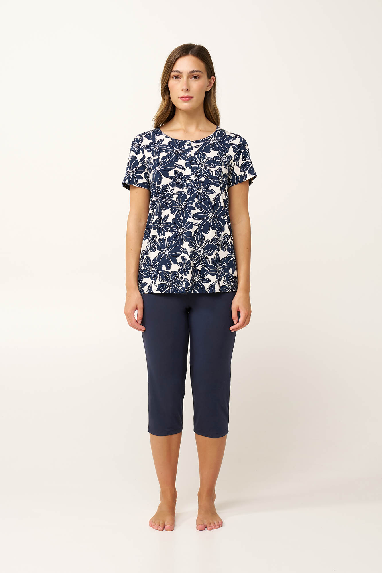 Αφεθείτε σε χαλαρές καλοκαιρινές βραδιές με αυτή τη γυναικεία πυτζάμα. Κατασκευασμένη από LENZING Tencel Modal Micro, προσφέρει απαλή, δροσερή και λεία αίσθηση στο δέρμα — ιδανική για ζεστές νύχτες. Το κοντομάνικο τοπ διαθέτει πατιλέτα και είναι διακοσμημένη με ένα εντυπωσιακό φλοράλ μοτίβο. Το σετ συμπληρώνει ένα μονόχρωμο κάπρι παντελόνι που ισορροπεί το σύνολο. Ιδανικό για στιγμές χαλάρωσης ή έναν άνετο ύπνο.