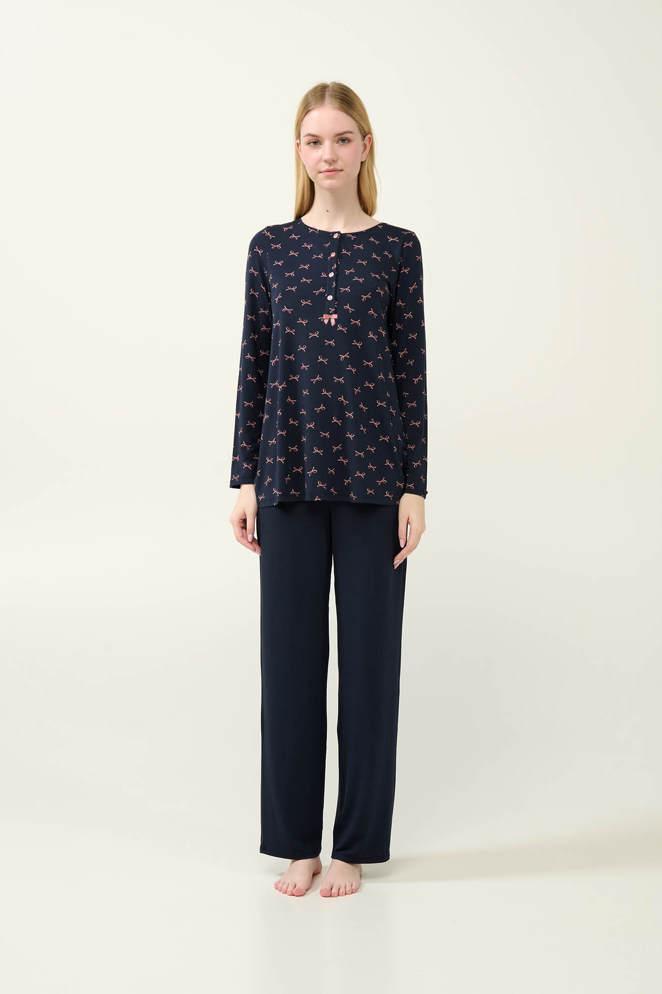 Επιλέξτε ένα σετ χειμερινές γυναικείες πυτζάμες, φτιαγμένο από πολυτελές LENZING Tencel Modal Micro. Η μπλούζα με μακριά μανίκια διακοσμείται με ρομαντικά ροζ φιογκάκια που απλώνονται σε σκούρο μπλε φόντο, ενώ η κλασική πατιλέτα προσθέτει μια διαχρονική πινελιά κομψότητας. Συνδυάζεται με μονόχρωμο παντελόνι, που προσφέρει ισορροπία στο σύνολο. Απολαύστε την απαλή υφή και την ελαστικότητα του υφάσματος, που εξασφαλίζουν βέλτιστη εφαρμογή και απόλυτη άνεση.
