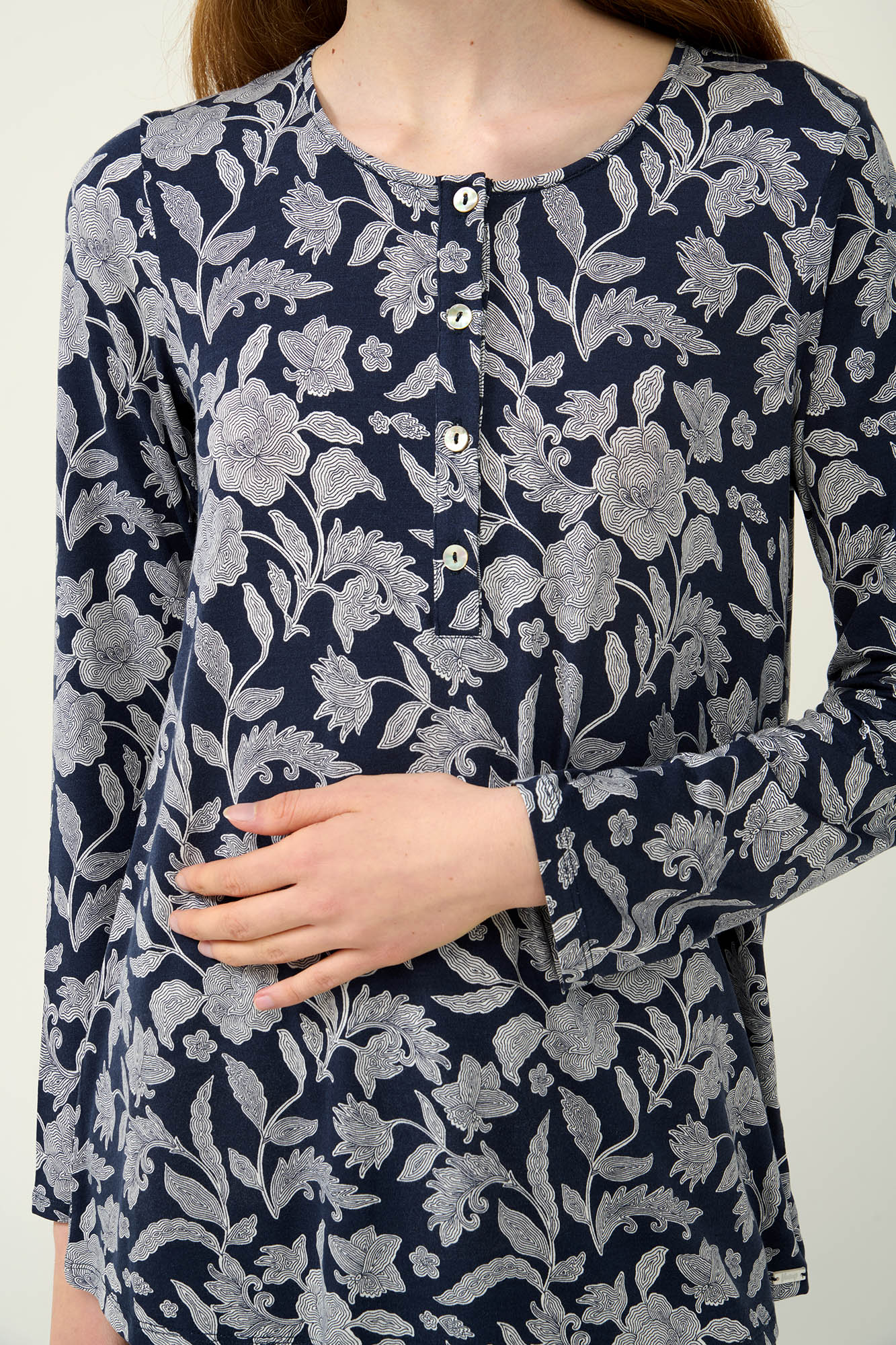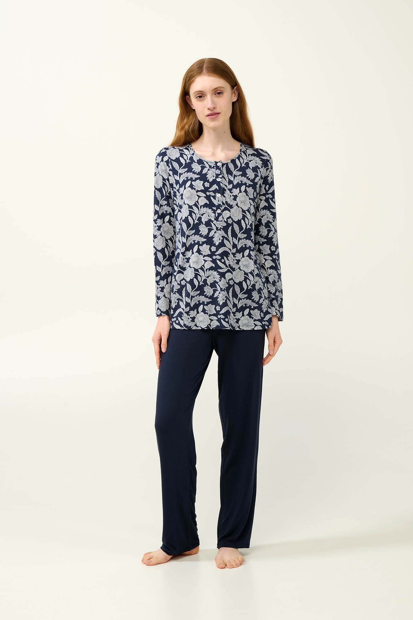 Απολαύστε ένα σετ γυναικείες χειμερινές πυτζάμες, κατασκευασμένες από LENZING Tencel Modal Micro, που αγκαλιάζει ευχάριστα το σώμα. Είναι σχεδιασμένο με πατιλέτα μπροστά και λευκό φλοράλ μοτίβο σε σκούρο φόντο, ενώ το παντελόνι είναι μονόχρωμο για διακριτική ισορροπία στο σύνολο. Ιδανική επιλογή για τις στιγμές χαλάρωσης στο σπίτι ή τον ύπνο.