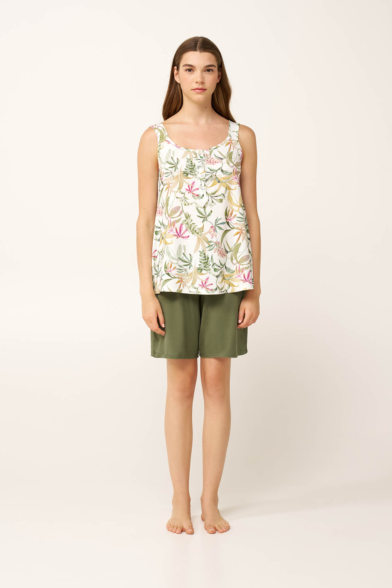 Απολαύστε τα καλοκαιρινά βράδια με άνεση χάρη σε αυτό το γυναικείο σετ πυτζάμες, κατασκευασμένο από εξαιρετικά απαλό και διαπνέον LENZING Tencel Modal Micro με elastane. Το αμάνικο τοπ ξεχωρίζει με ένα ζωντανό botanical print που προσθέτει κομψότητα και φρεσκάδα, ενώ το μονόχρωμο, κοντό παντελόνι ισορροπεί αρμονικά το σύνολο. Ελαφρύ και δροσερό, το σετ αυτό είναι ιδανικό για χαλάρωση στο σπίτι ή για έναν ήρεμο, ξεκούραστο ύπνο.